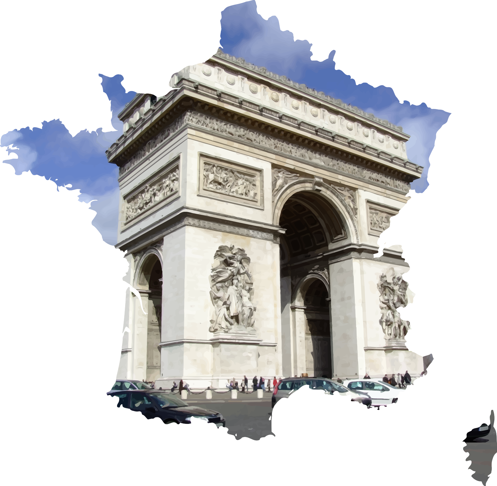 This features a large white stone arch, which is the Arc de Triomphe monument. This iconic landmark is located in Paris and stands as a symbol of victory for France. The arch has intricate carvings on its surface, showcasing the craftsmanship of the architects who designed it. In addition to the impressive architecture, there are several cars parked around the monument, indicating that it is a popular tourist attraction. Many people can be seen walking and exploring the area, admiring the beauty of this historic structure. The combination of the Arc de Triomphe monument and the bustling cityscape creates an interesting contrast between history and modernity.