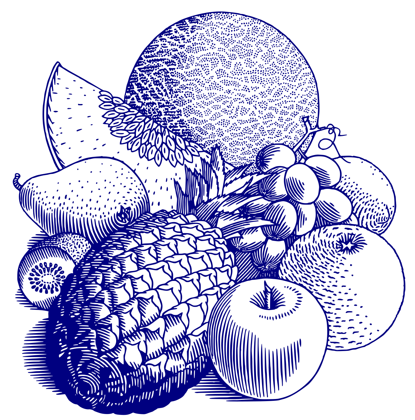 This features a colorful and detailed illustration of various fruits. In the center, there is an apple surrounded by other fruits such as a pineapple, melon, kiwi, grapes, orange, and another apple. These fruits are arranged in a visually appealing manner, creating a sense of abundance and freshness. The illustration looks like it was done in blue pen ink, which adds to the overall charm and artistic quality of the image.