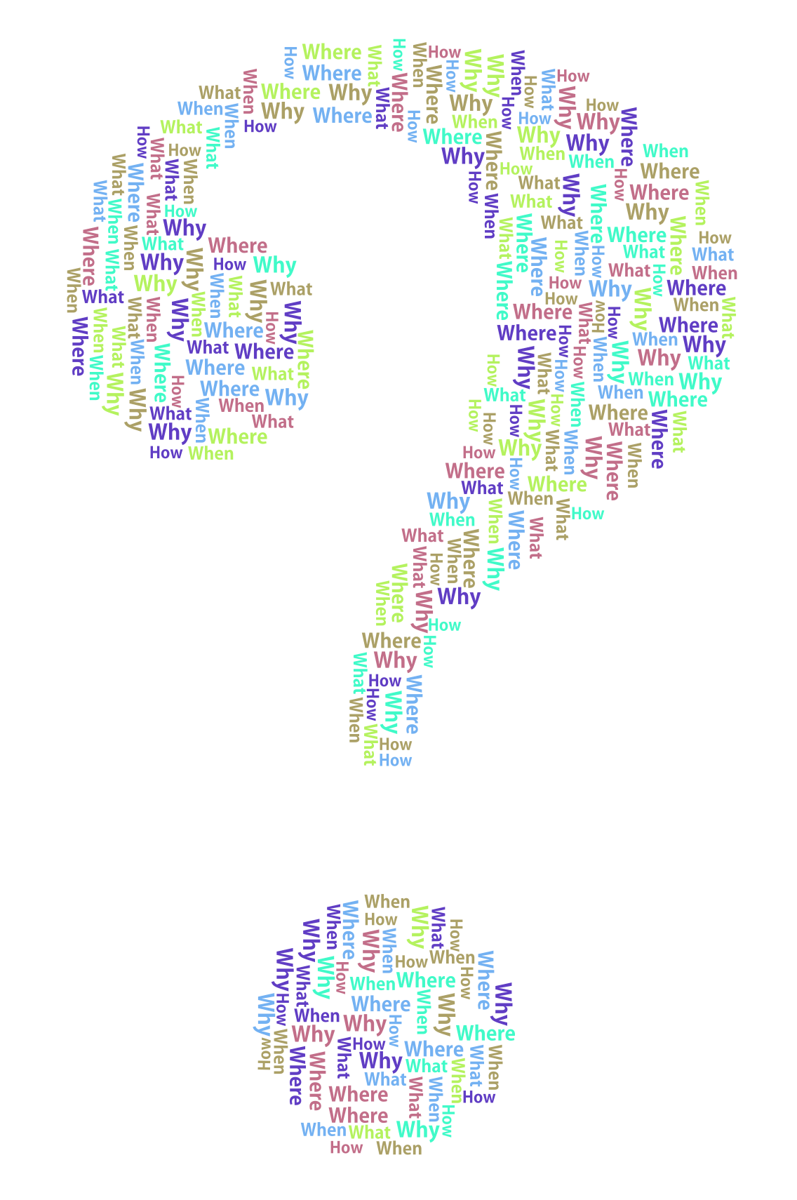 This features a large, colorful word cloud made up of various words that spell out the question "Why?" in different colors. The word "why" is displayed prominently in the center of the cloud, surrounded by other related words such as "where," "when," and "what." These words are arranged in a visually appealing manner, creating an eye-catching display that invites viewers to ponder the question at hand. The word cloud serves as both an artistic representation and a thought-provoking visual aid for those seeking answers or understanding.