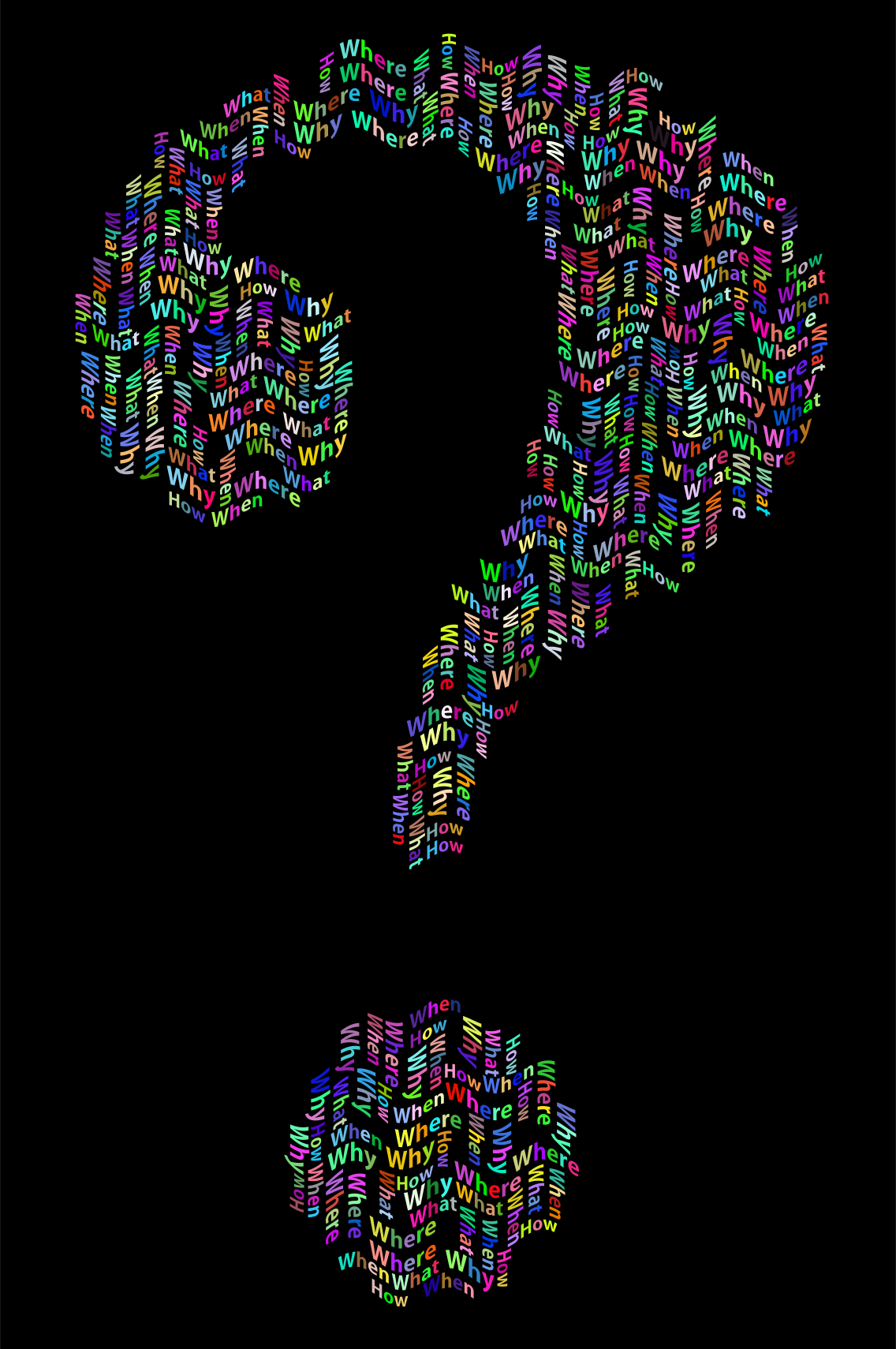 This features a large, colorful question mark made up of many smaller question marks. These smaller question marks are arranged in various positions and orientations throughout the larger one, creating an intricate pattern that fills most of the frame. The overall effect is visually striking and captivating, with each individual question mark contributing to the vibrant composition.