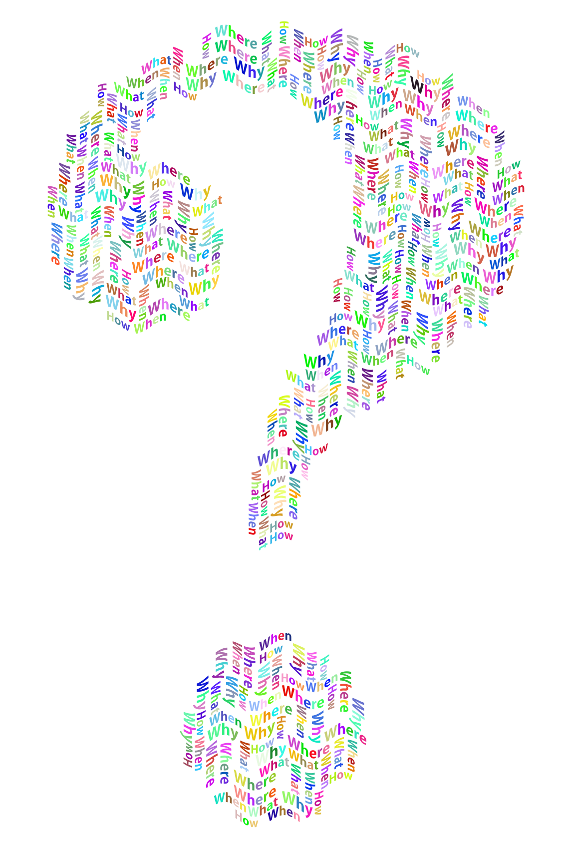 This features a large, colorful question mark made up of various words. These words are arranged in such a way that they create the shape of a question mark, with each word being different colors and sizes. The words are wavy, giving the impression of movement or energy to the design. This creative display of letters can be seen as an artistic representation of curiosity or thought-provoking questions.