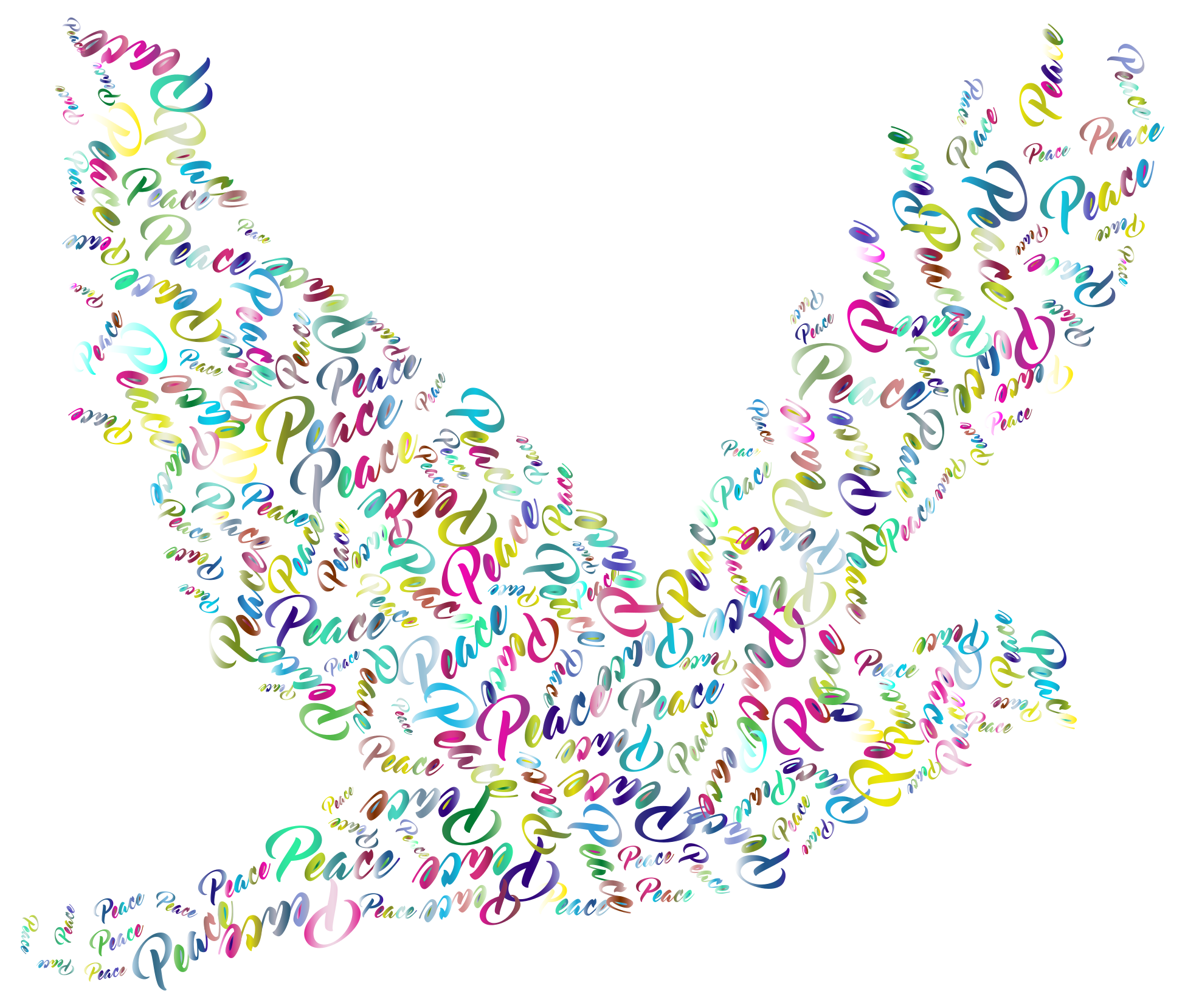This features a large, colorful dove with wings spread wide. The dove is adorned with various words and phrases written in different colors, creating an eye-catching and vibrant display. These words are arranged all over the dove's body, filling its wings and surrounding it from every angle. The combination of the dove's shape and the colorful text creates a visually striking piece that is both artistic and meaningful.