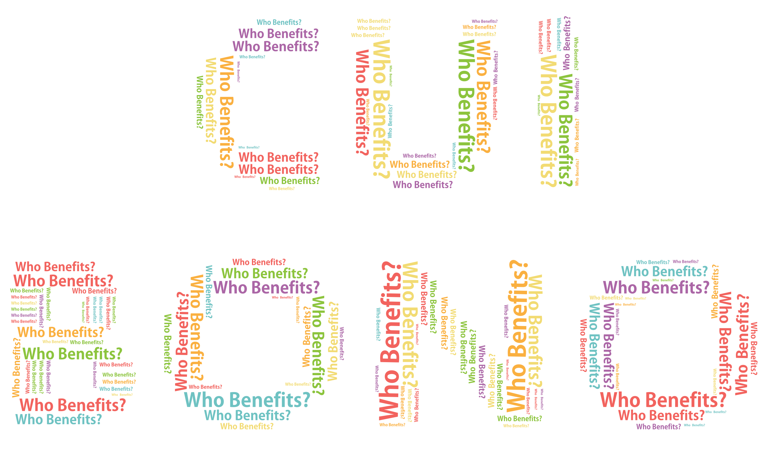 This is a colorful word cloud that reads "Cui Bono" in various colors. The words are arranged in a visually appealing manner, with each letter colored differently to create a vibrant and eye-catching display. The word "Cui Bono" is written in different shades of red, green, blue, yellow, and orange, making it stand out against the background. This creative presentation of text can be used for various purposes such as advertising or educational materials to draw attention and convey a message effectively.