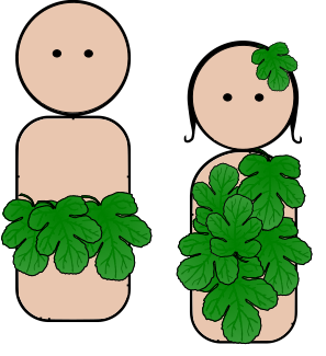 This features two cartoon characters, a man and a woman, who are both wearing green leaves as clothing. They appear to be standing next to each other in the scene. The woman is positioned slightly behind the man, with her head peeking out from behind him. Both figures have smiling faces, adding a playful touch to their appearance.