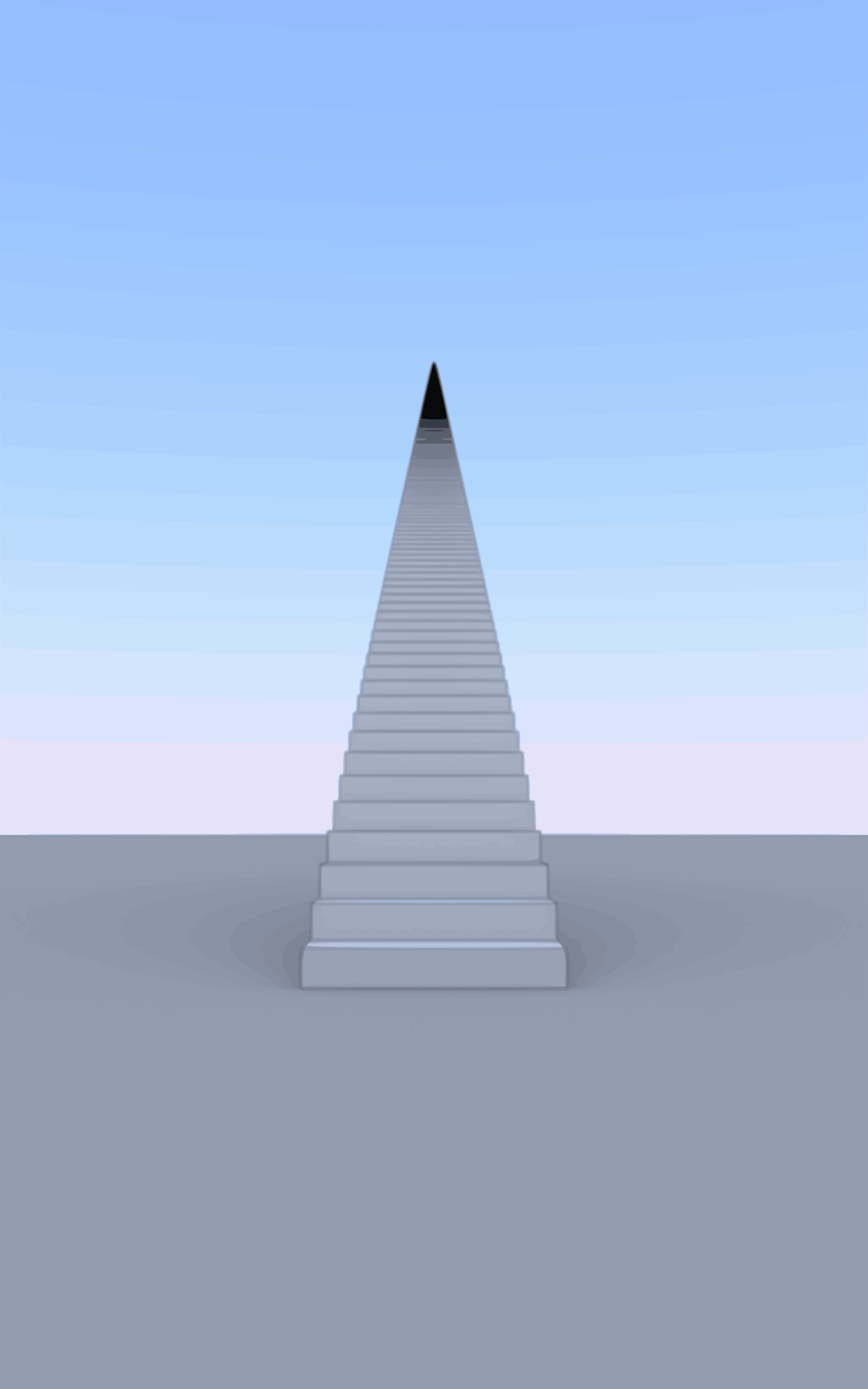 This features a large, tall staircase that appears to be made of stone. It is situated in the middle of an open area with no other objects or structures visible around it. The stairs are positioned at an angle and seem to extend into the distance, giving the impression of a long journey ahead. The overall scene has a somewhat surreal quality due to its simplicity and lack of context.