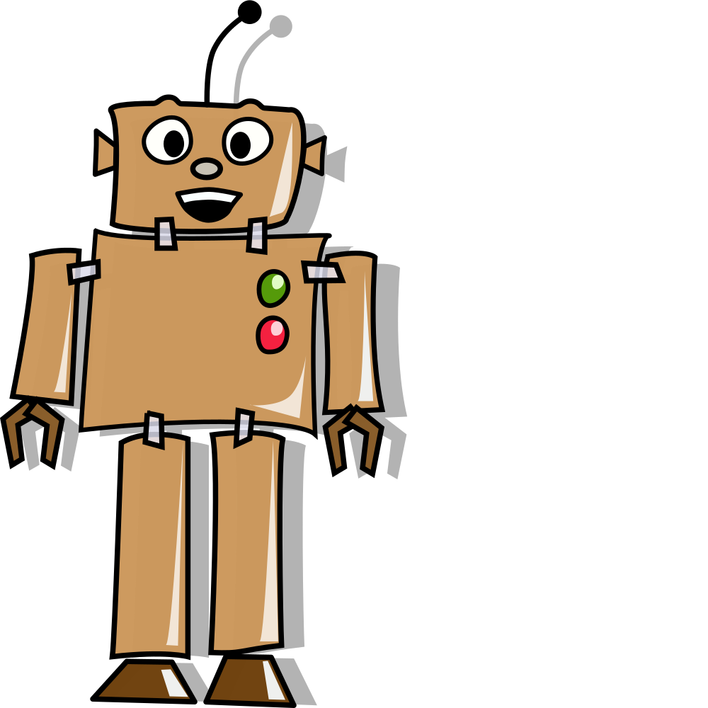 This features a cartoon robot with a big smile on its face. It is standing in front of a white background, and it appears to be the main focus of the scene. The robot has a brown color and is wearing a green button on its chest. Its legs are positioned apart from each other, giving it an interesting stance. The overall appearance of the robot gives off a friendly and playful vibe.