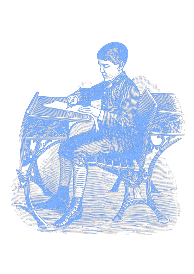 This features a young boy sitting on a chair, wearing a suit and tie. He appears to be writing or reading something while seated in the chair. The scene is depicted in blue tones, giving it an old-fashioned feel. There are two chairs visible in the image; one that the boy is sitting on and another smaller chair located further back. Additionally, there is a book placed near the boy, possibly indicating his reading material or study materials. The overall atmosphere of the scene suggests a moment of quiet reflection or concentration for the young man.