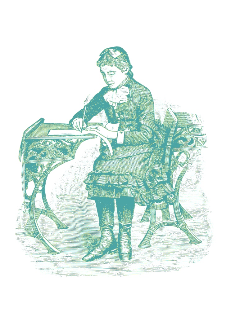 This features a woman sitting at a desk, reading a book. She is wearing a dress and appears to be focused on her reading material. A chair can be seen next to the desk where she sits. The scene has an old-fashioned feel with its vintage appearance.