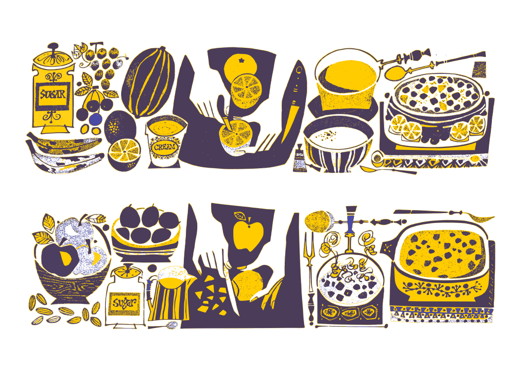 This is a colorful illustration of various food items and kitchen utensils. There are two main recipes displayed, each with its own set of steps and ingredients. In the first recipe, there are several bowls containing different fruits such as apples, oranges, and bananas. Additionally, there is a cup placed near the top left corner of the image. The second recipe features an assortment of items including a spoon, fork, knife, and a bottle. A cake can also be seen in the middle of the scene, adding to the variety of food items depicted. Overall, this illustration showcases a diverse range of ingredients and kitchen tools used for preparing delicious meals.
