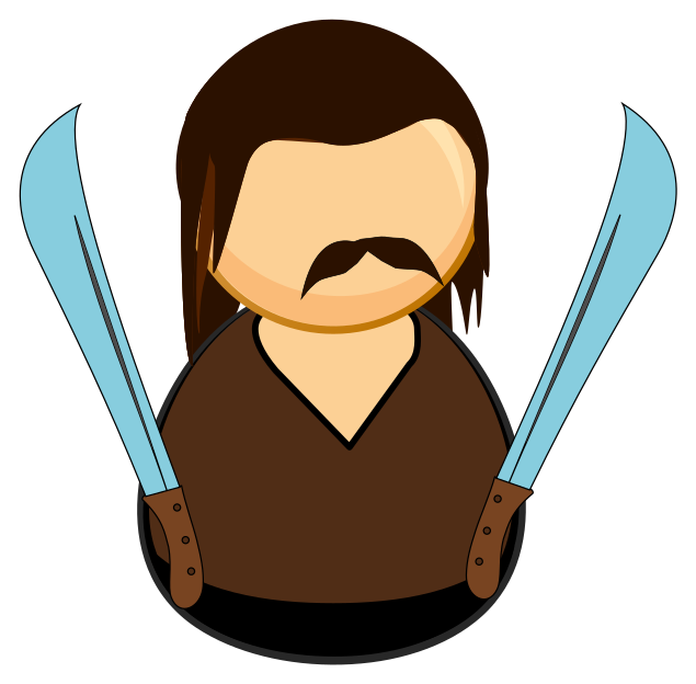 This features a man with a beard and mustache, holding two blue swords in his hands. He appears to be wearing a brown shirt and has a somewhat angry expression on his face. The man is the main focus of the scene, taking up most of the frame. The swords are positioned close together, one on each side of him, creating an interesting visual contrast between the man's facial features and the weapons he holds.