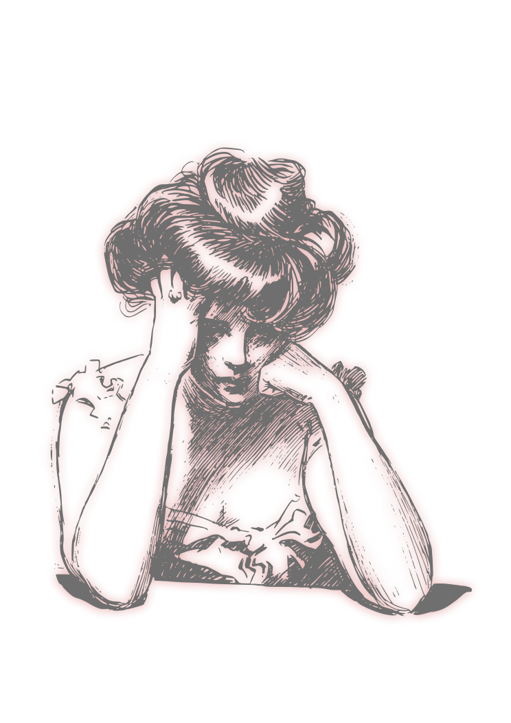 This features a woman with curly hair, wearing a dress and sitting at a table. She appears to be in distress or discomfort as she rests her head on her hand. Her posture suggests that she is deep in thought or experiencing some form of emotional turmoil. The drawing style gives the impression of an old-fashioned, vintage portrait, adding a sense of nostalgia to the scene.