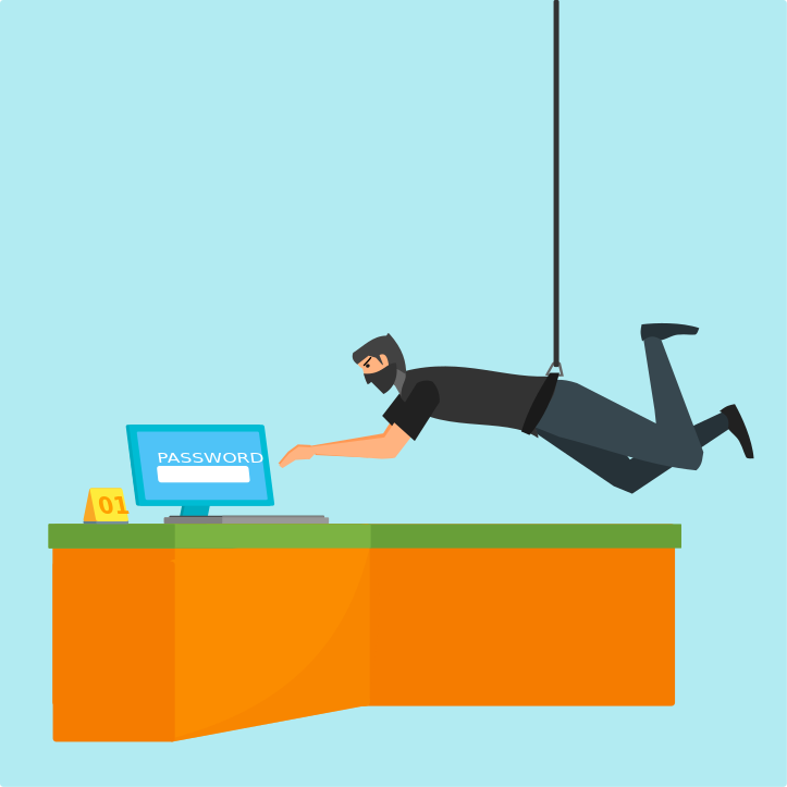 This features a man in black clothing, who appears to be a thief or hacker, attempting to access a computer. He is hanging from a rope and using his hand to type on the keyboard of the laptop placed on the desk. The scene seems to take place in an office setting with a chair nearby. The man's actions suggest that he might be trying to steal passwords or sensitive information, but it remains unclear whether his intentions are malicious or simply curious.