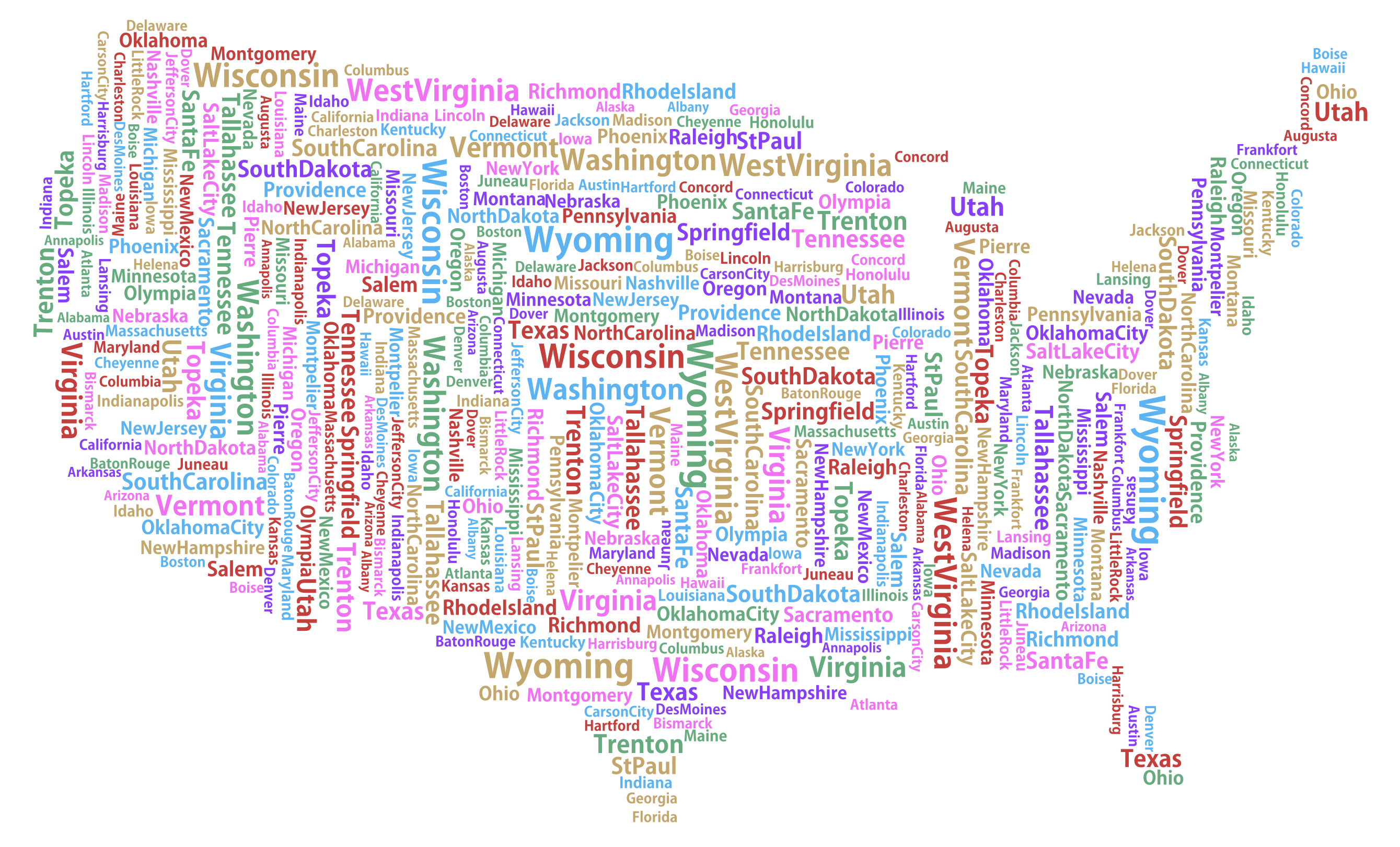 This is a map of the United States, with each state represented by its name in a different color. The states are connected to one another through various lines and arrows, indicating their borders and connections. The map is filled with many different colors, making it visually appealing and easy to read. The names of the states are written out in a large font, allowing for clear visibility of each individual state. Overall, this map provides an excellent representation of the United States' geography and its various components.