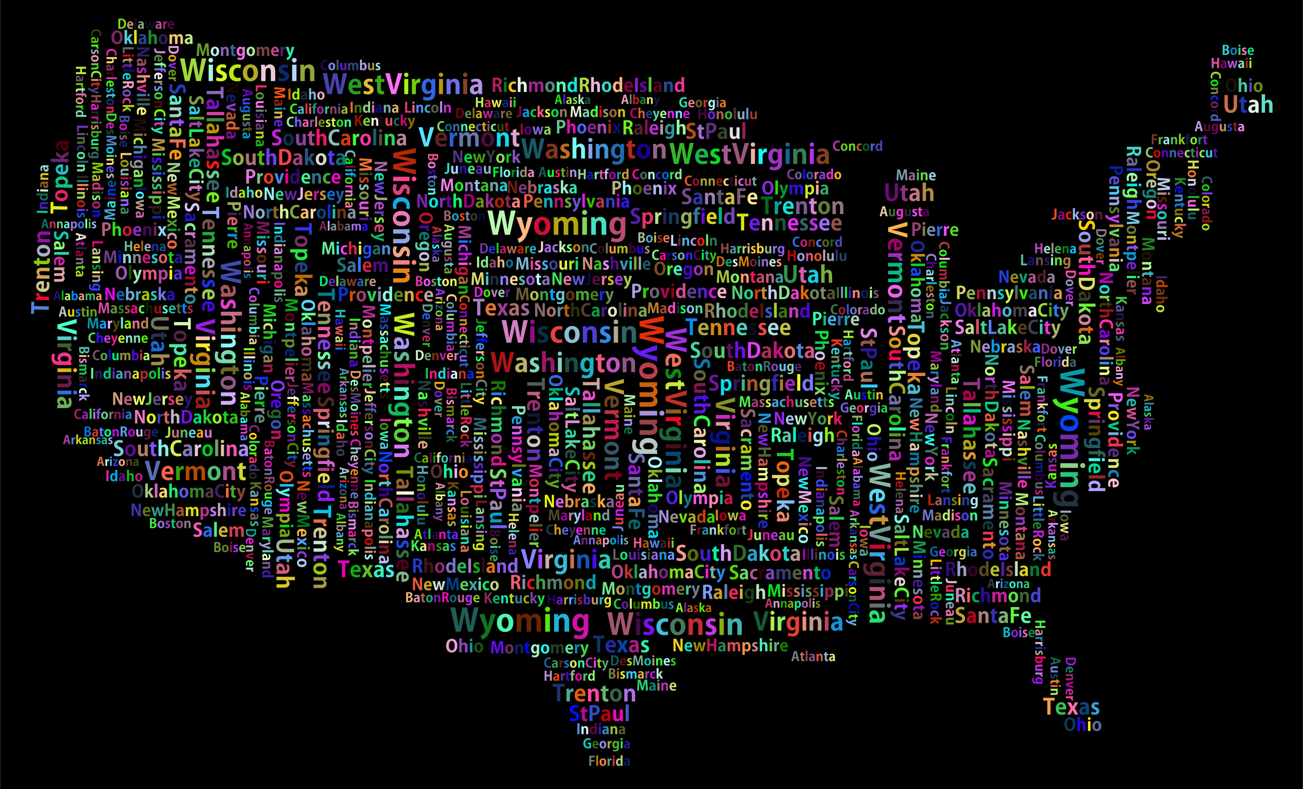This is a black and white picture of the United States, with each state's name written in different colors. The states are arranged in a way that they fill up most of the frame, creating an interesting visual effect. The various colors used for each state make it easy to identify them, even though some may be more prominent than others due to their size or color contrast. Overall, this image is a creative and unique representation of the United States' states.