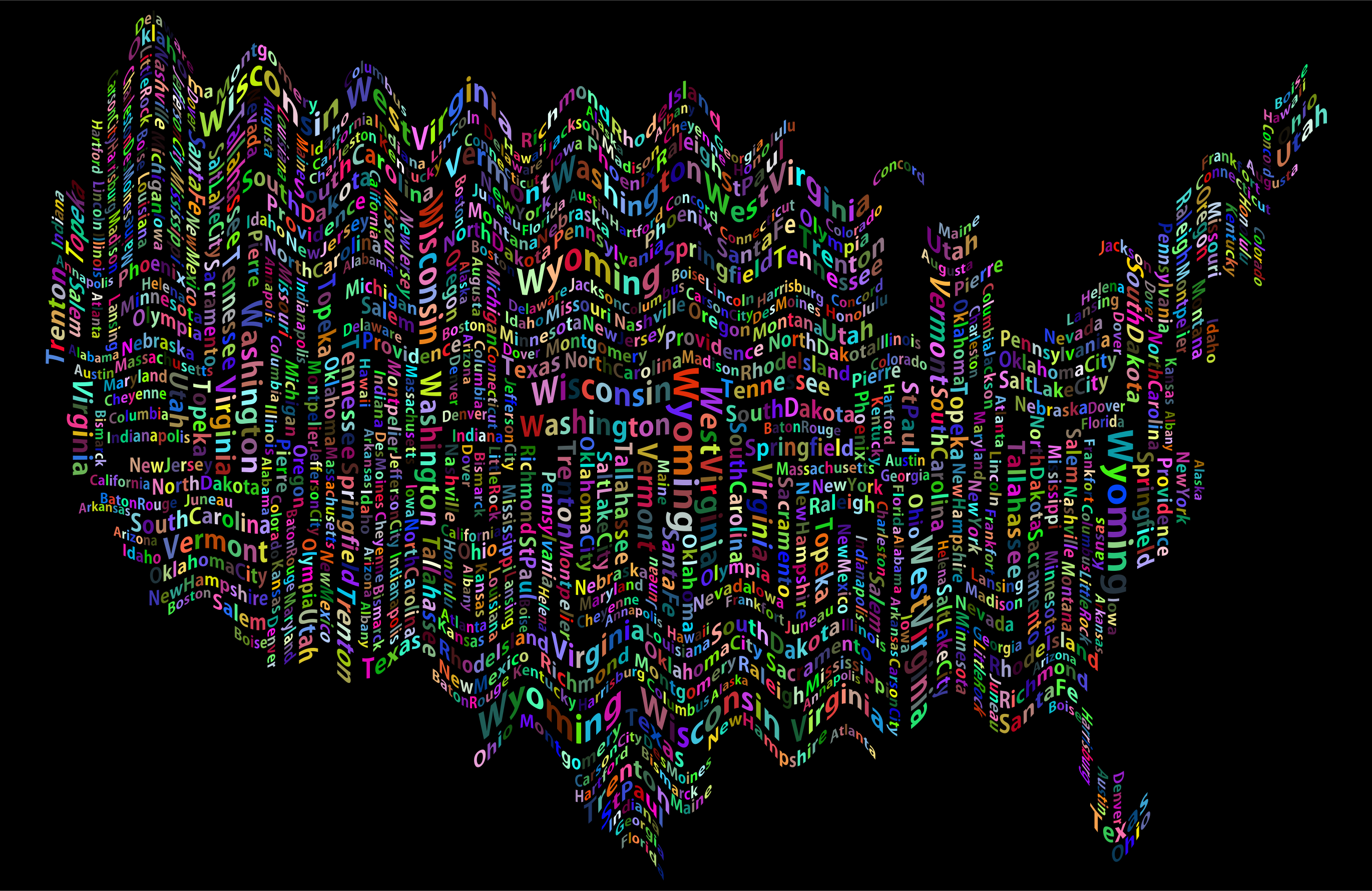 This features a map of the United States, but instead of being a traditional representation of the country, it is made up of various words and phrases. These words are arranged in such a way that they form the shape of the continental United States. The words themselves appear to be written in different colors, adding visual interest to the image. This creative approach to representing the country showcases the power of language and its ability to convey complex ideas through simple shapes and colors.