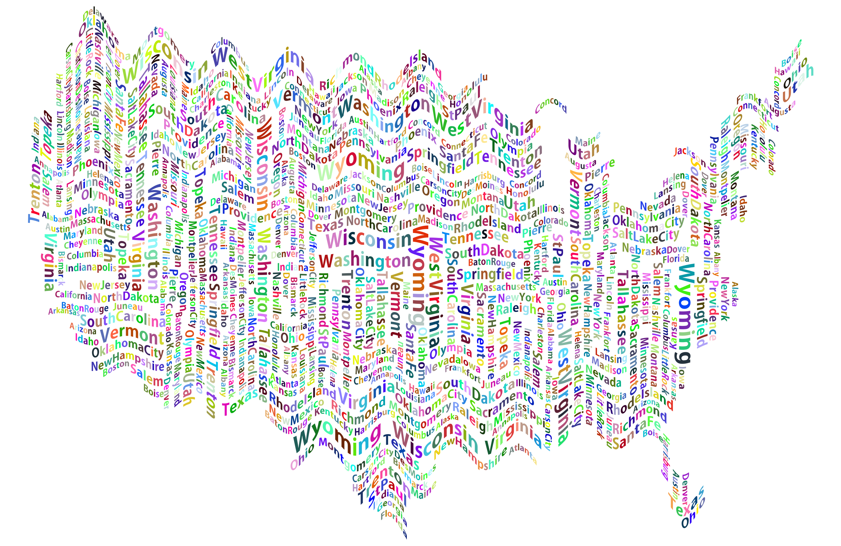 This is a colorful map of the United States, with each state represented by a different colored letter. The letters are arranged in such a way that they form words and phrases related to the states. For example, the word "Washington" is written using the letters W, A, S, H, I, T, O, N, and R. This creative representation of the United States showcases the diversity and uniqueness of each state through the use of colorful letters.