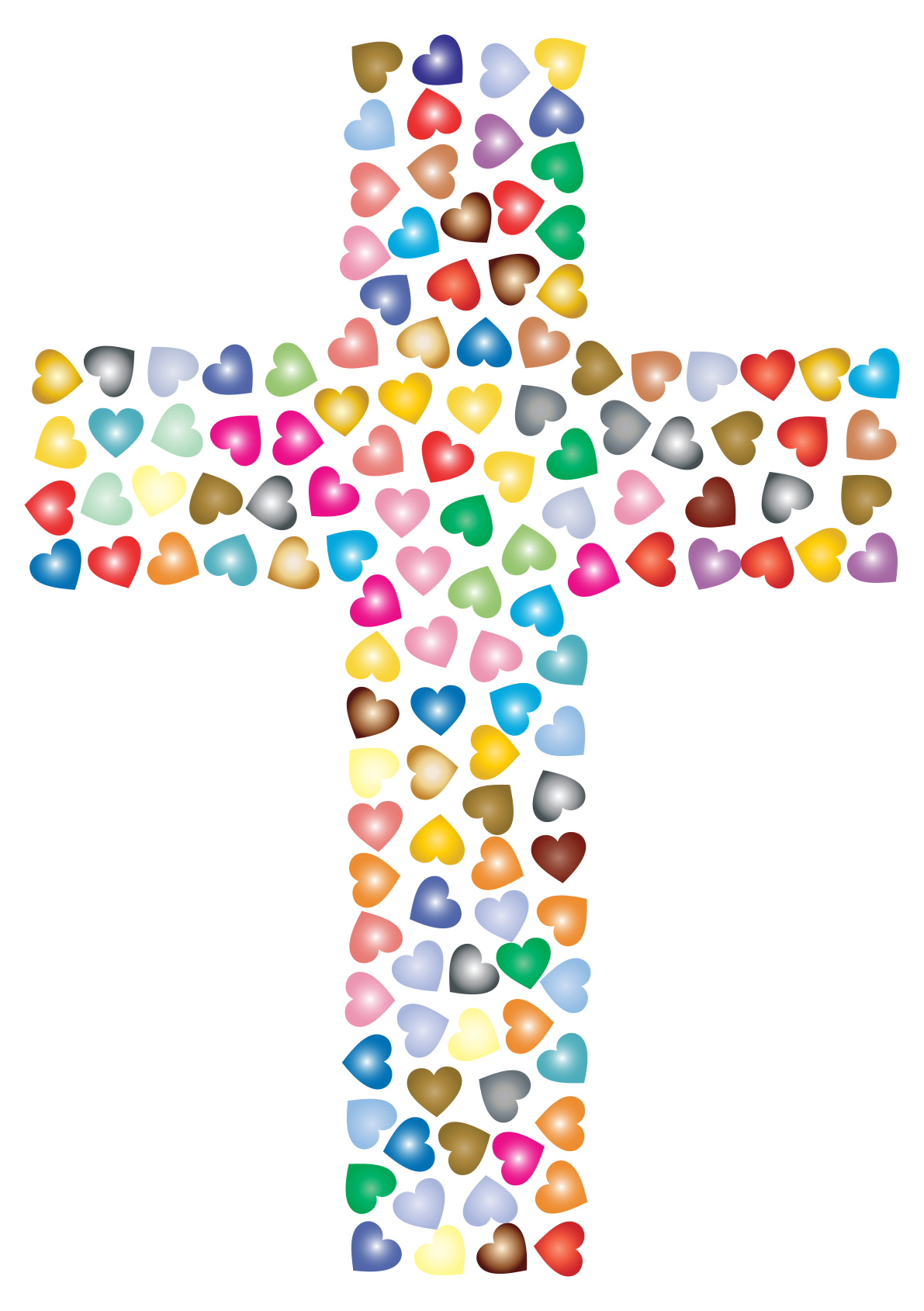 This features a large cross made up of various colored hearts. The hearts are arranged in such a way that they form the shape of a cross, with each heart representing a different color. There is an abundance of hearts on the cross, making it visually striking and unique. The hearts come in a variety of colors, including pink, yellow, orange, green, blue, and red. This creative display of hearts creates a sense of unity and harmony, while also showcasing the diversity of colors found within the hearts.