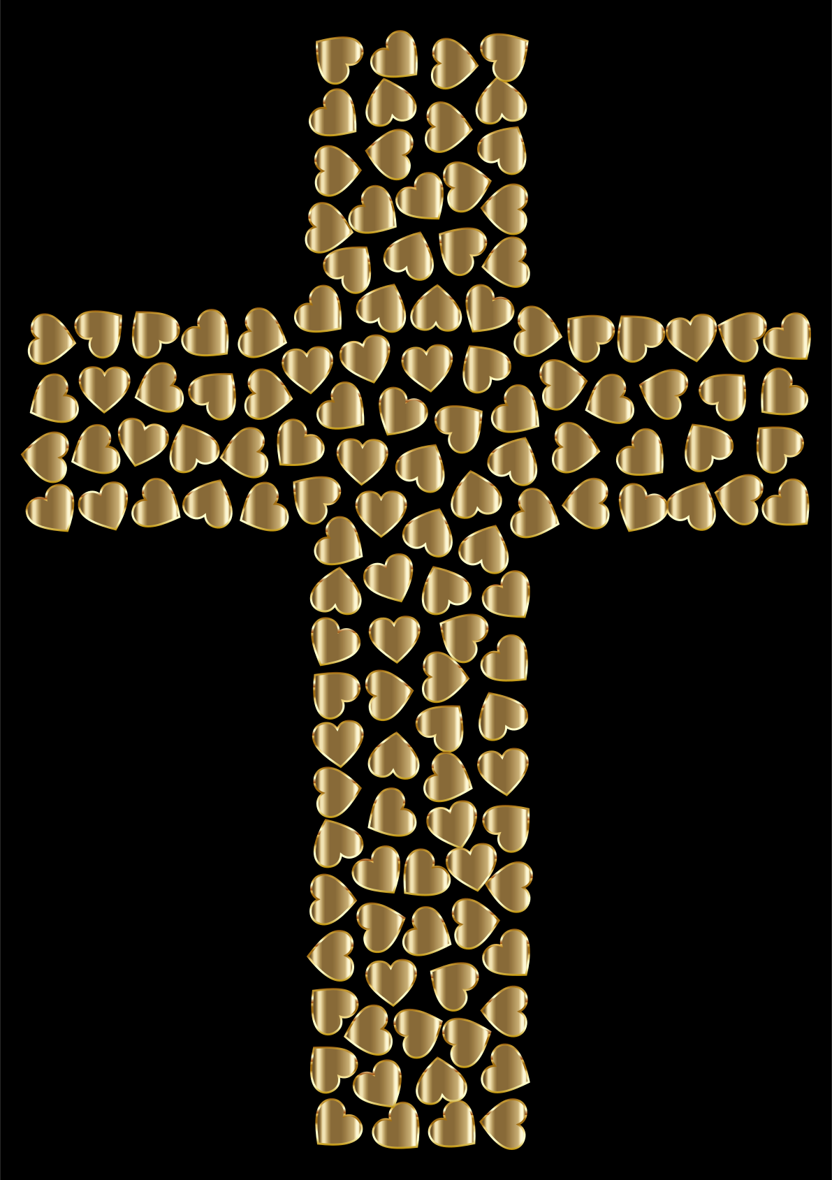 This features a large cross made up of numerous small hearts. These hearts are arranged in various positions around the cross, creating an intricate and visually appealing design. The hearts come in different sizes and shapes, adding depth and complexity to the overall composition. The cross is set against a dark background, which further emphasizes the contrast between the golden hearts and the black backdrop. This unique artwork showcases creativity and craftsmanship, making it an eye-catching piece of art or decoration.