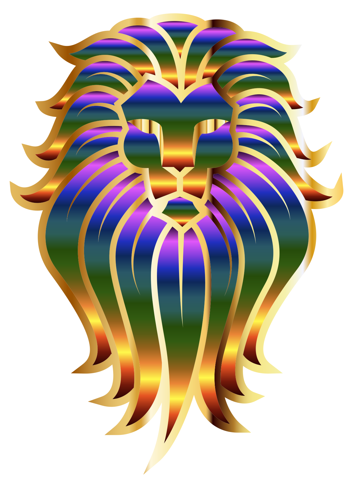 This features a colorful lion with a golden outline. It is a prismatic colored lion, which means that its colors are not solid but rather intermingled and blended together. The lion's head is prominently displayed in the image, making it the focal point of the picture. The vibrant colors and intricate design make this lion an eye-catching and unique symbol.