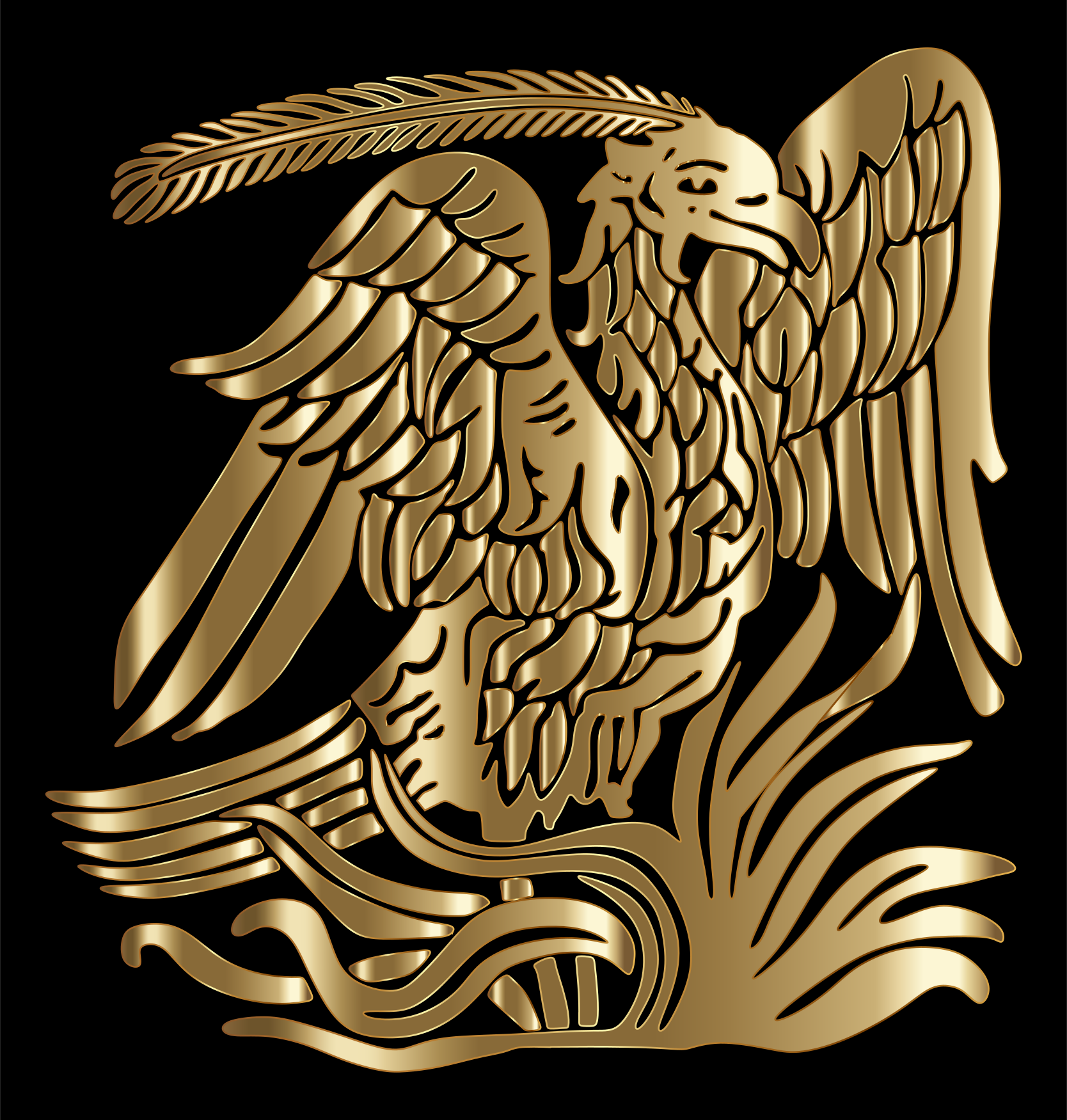 This features a large, intricately designed eagle with its wings spread wide. The bird is adorned in gold and has an impressive appearance. Its wings are spread across the entirety of the image, showcasing the beauty of its feathers. The eagle's head is turned to the side, adding a sense of motion and life to the design. This artistic representation of the majestic bird creates a striking visual impact on the viewer.