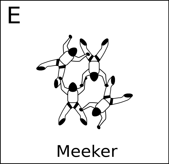 This features a group of five people in the air, each holding onto one another's hands. They are all wearing black and white outfits, giving them an athletic appearance. The individuals appear to be performing a synchronized skydiving maneuver, showcasing their teamwork and skill. The image is labeled with the name "Meeker," which could possibly indicate that this is a competition or demonstration involving this particular group of people.