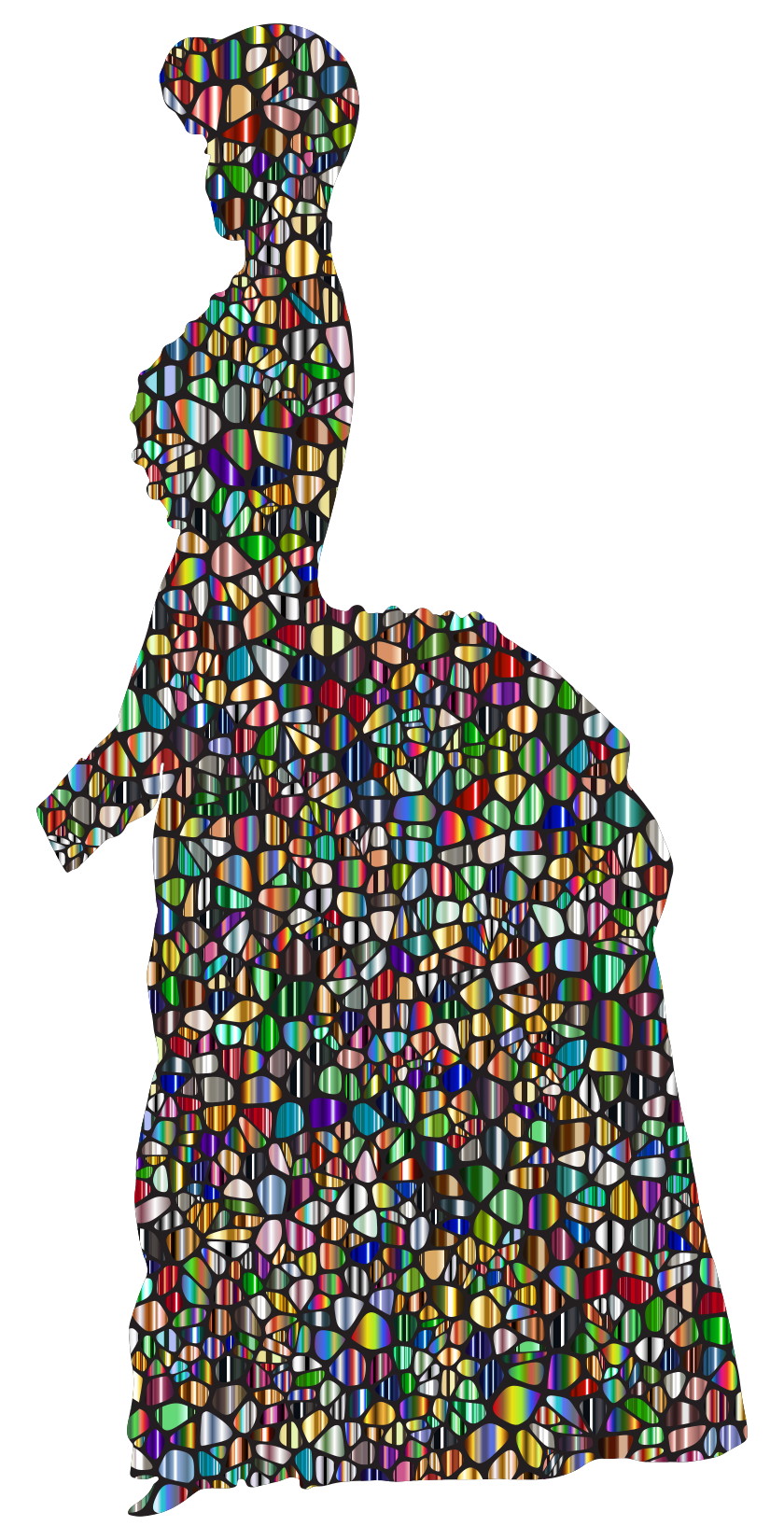 This features a unique and intricate design of a woman's figure, made up of various colored shapes. These shapes are arranged in such a way that they create the illusion of a person standing or sitting down. The colors used for this artistic representation include shades of green, red, blue, yellow, and orange. The overall effect is an eye-catching and visually appealing piece of artwork that showcases creativity and skill in design.