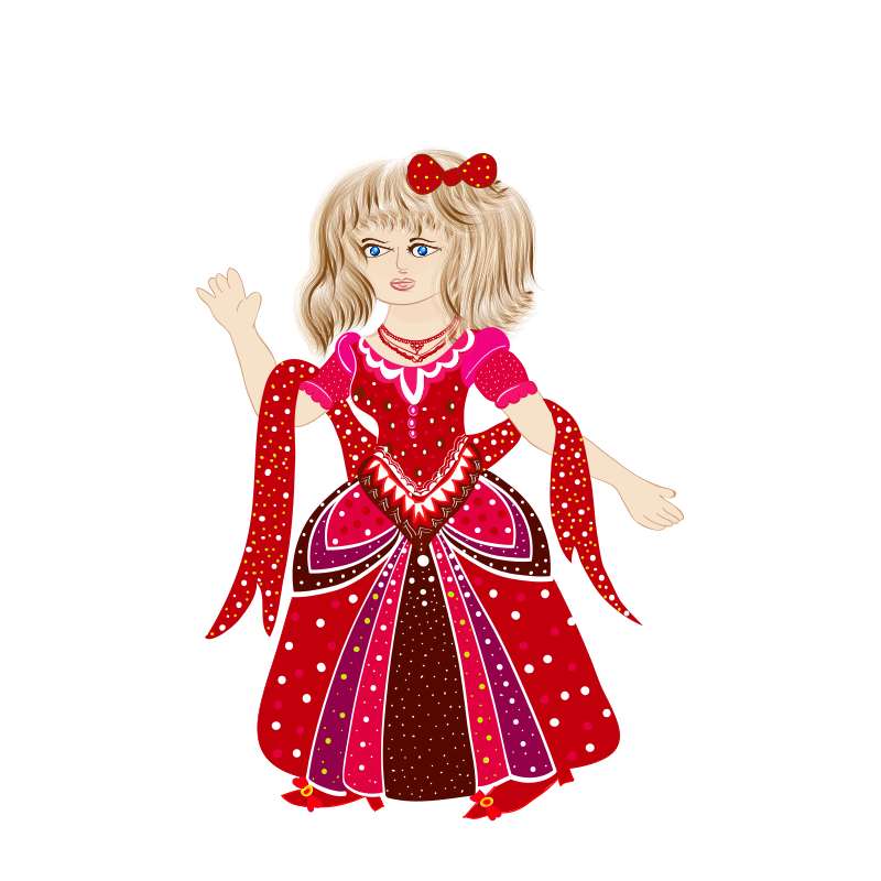 This features a beautifully designed doll dressed in a red and pink dress. She is wearing a bow on her head, adding to the charm of the scene. The doll appears to be standing with one hand raised, possibly waving or gesturing towards something. The overall appearance of the doll suggests that she might be a Barbie-like character, dressed in an elegant and colorful outfit.
