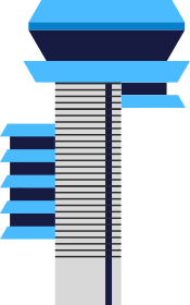 This features a tall tower with a blue and white striped design. It appears to be an artistic representation of the tower, as it is not a real-life structure. The tower has several windows on its sides, which are also painted in black and white. The overall appearance of the tower gives off a sense of modernity and sophistication.