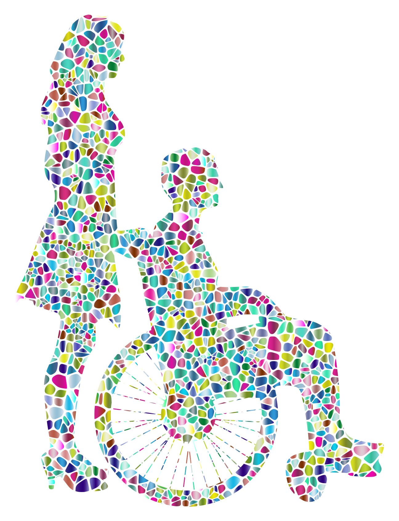 This features a unique and artistic representation of a man in a wheelchair, surrounded by colorful dots. This creative portrayal is reminiscent of the famous artist Jackson Pollock's style, where he used to paint with dripping lines. In this case, the dots are arranged around the man in the wheelchair, creating an interesting visual effect. The image also includes a woman standing next to the man in the wheelchair, further emphasizing the connection between them. This artistic representation of everyday life showcases the importance of inclusivity and accessibility for all individuals.