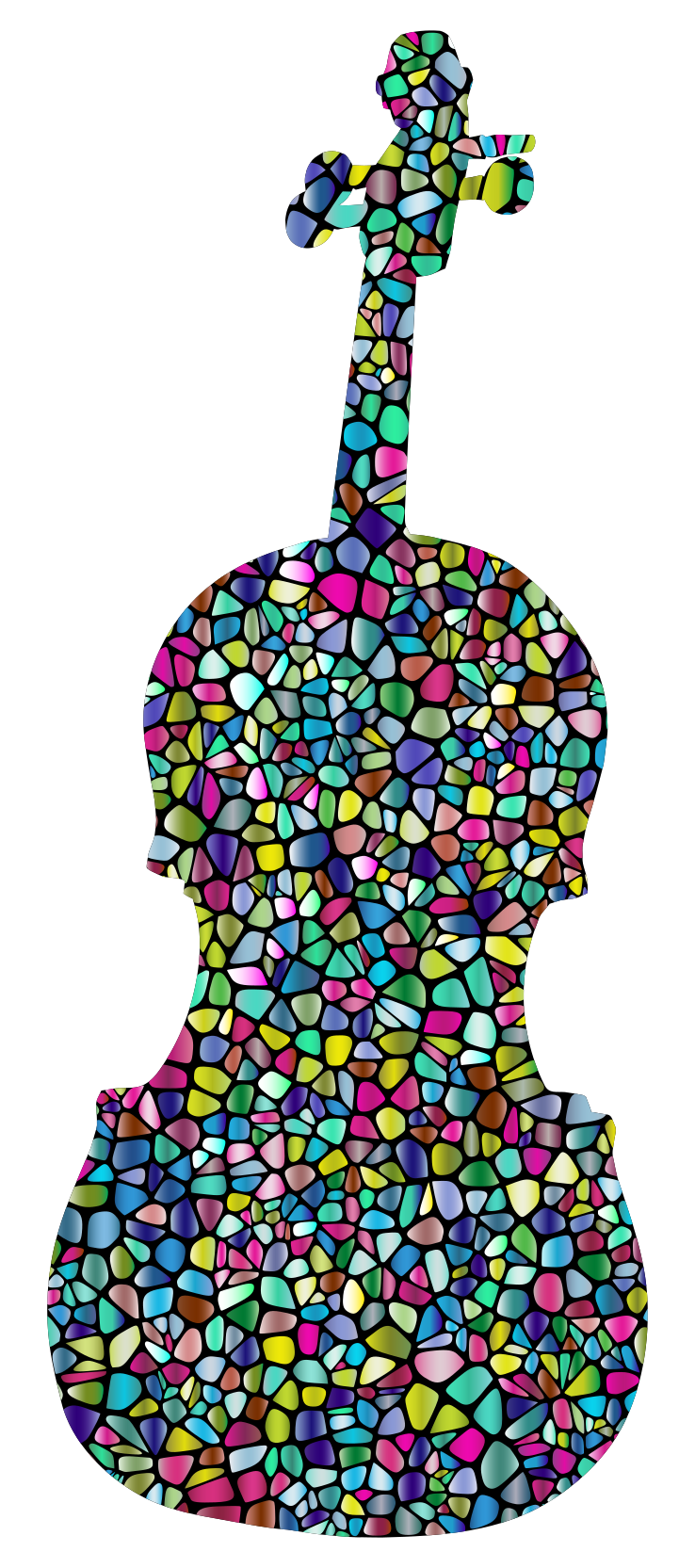 This features a colorful violin with a unique design, made up of various shapes and colors. It is placed against a white background that contrasts beautifully with the vibrant tones of the violin. The violin's intricate pattern creates an eye-catching visual effect, making it stand out in the scene. This artistic representation of a musical instrument showcases creativity and skill in its design.