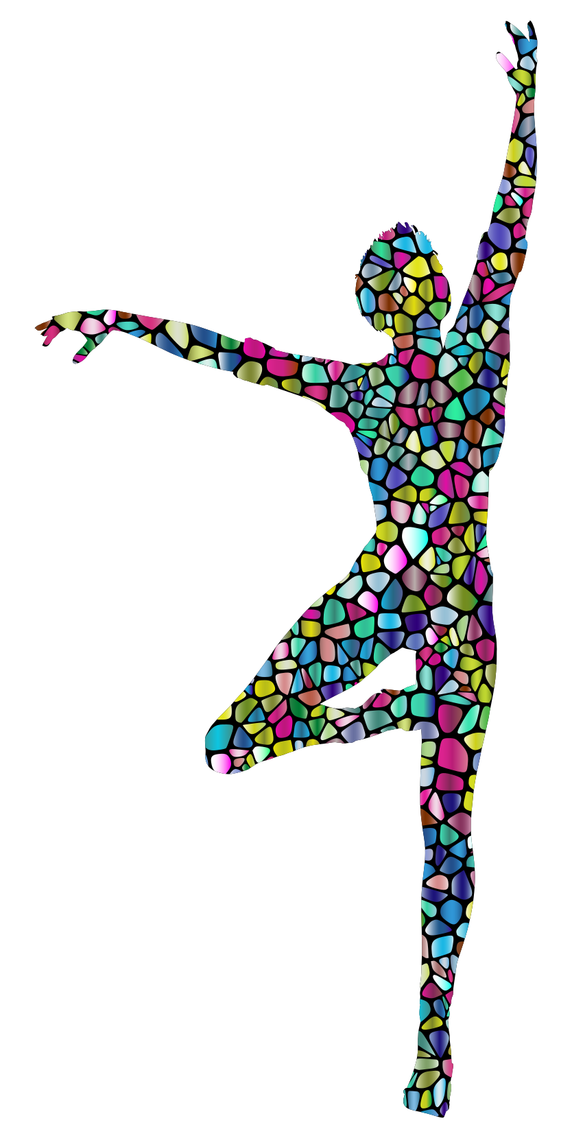 This features a woman in motion, captured in a colorful and artistic manner. She is depicted as a silhouette of a dancer, with her body made up of various shapes and colors. These shapes and colors create an interesting visual effect that adds depth to the scene. The woman appears to be performing a ballet pose, showcasing her grace and skill in dance. The combination of vibrant colors and intricate patterns on her figure creates a captivating and dynamic image.