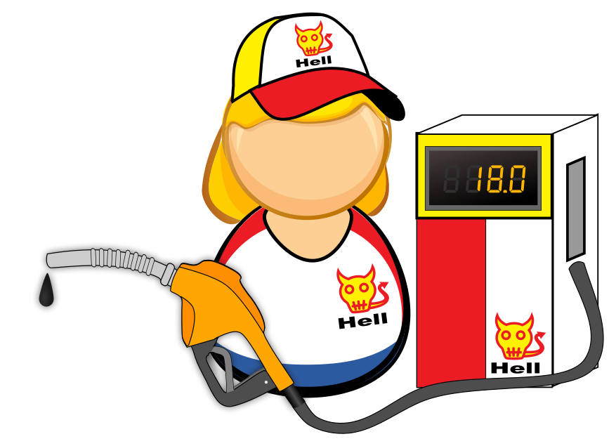 This features a cartoon character, possibly a woman or a girl, wearing a hat and holding an oil pump. She is standing next to a gas pump that has the word "Hell" written on it. The scene appears to be set in a gas station, with the cartoon figure prominently displayed in front of the gas pump. The overall atmosphere suggests a playful or humorous take on the typical gas station experience.