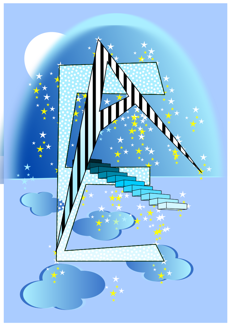 This features a unique and creative design of an open umbrella made out of stairs. This artistic representation is set against a backdrop of a blue sky with white clouds, giving the impression that it's raining stars. The staircase umbrella has a whimsical appearance, as if it were floating in mid-air. The overall scene exudes a sense of playfulness and imagination, making it an interesting visual piece.