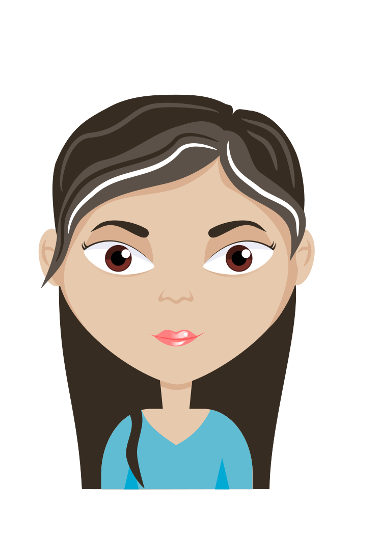 This features a cartoon drawing of a woman with long brown hair. She has two white streaks in her hair and is wearing a blue shirt. Her eyes are open, giving the impression that she's looking directly at the viewer. The overall style of the drawing gives it a whimsical and playful appearance.