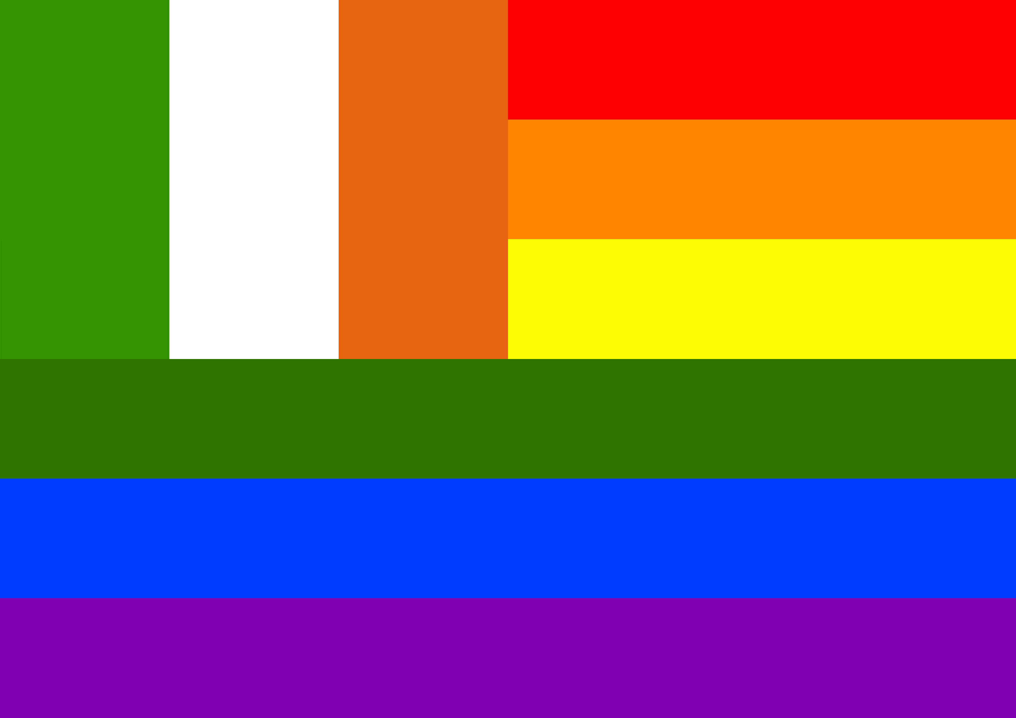 This features a rainbow flag with the colors of red, orange, yellow, green, blue, and purple. The flag is displayed prominently in the center of the picture, taking up most of the space. In addition to the main rainbow flag, there are two smaller flags visible on the left side of the image. These flags appear to be a combination of red, white, and green, which may represent Ireland or another country. The overall scene showcases a vibrant display of colors and flags, creating an eye-catching visual effect.