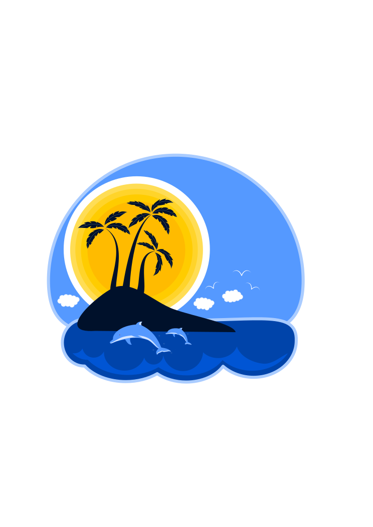 This features a small blue circle with a tropical scene in the middle. In this scene, there is a silhouette of a tiny island with palm trees in front of a large sun. Above the island, there are two birds flying through the sky. Additionally, several dolphins can be seen jumping out of the water near the island, adding to the lively atmosphere of the image. The combination of the tropical elements and the presence of wildlife creates an inviting and serene environment.