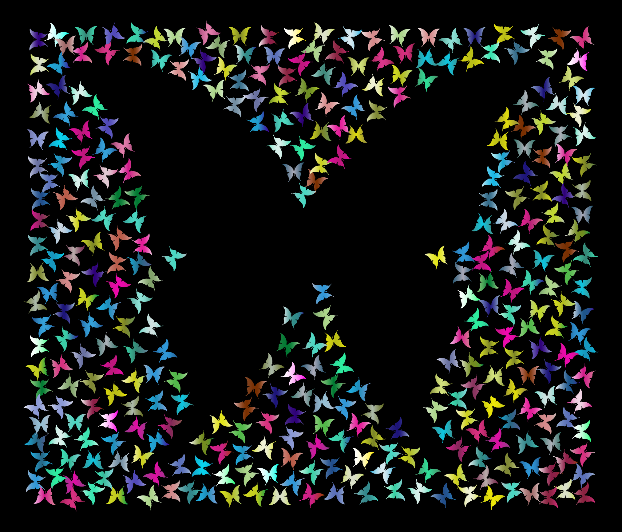 This features a black background with a large, colorful butterfly design. The butterfly is made up of numerous small butterflies arranged in various positions and colors. These smaller butterflies are scattered throughout the scene, creating an intricate and visually appealing pattern. The overall effect is that of a vibrant and lively artwork, with each individual butterfly adding to the richness of the design.