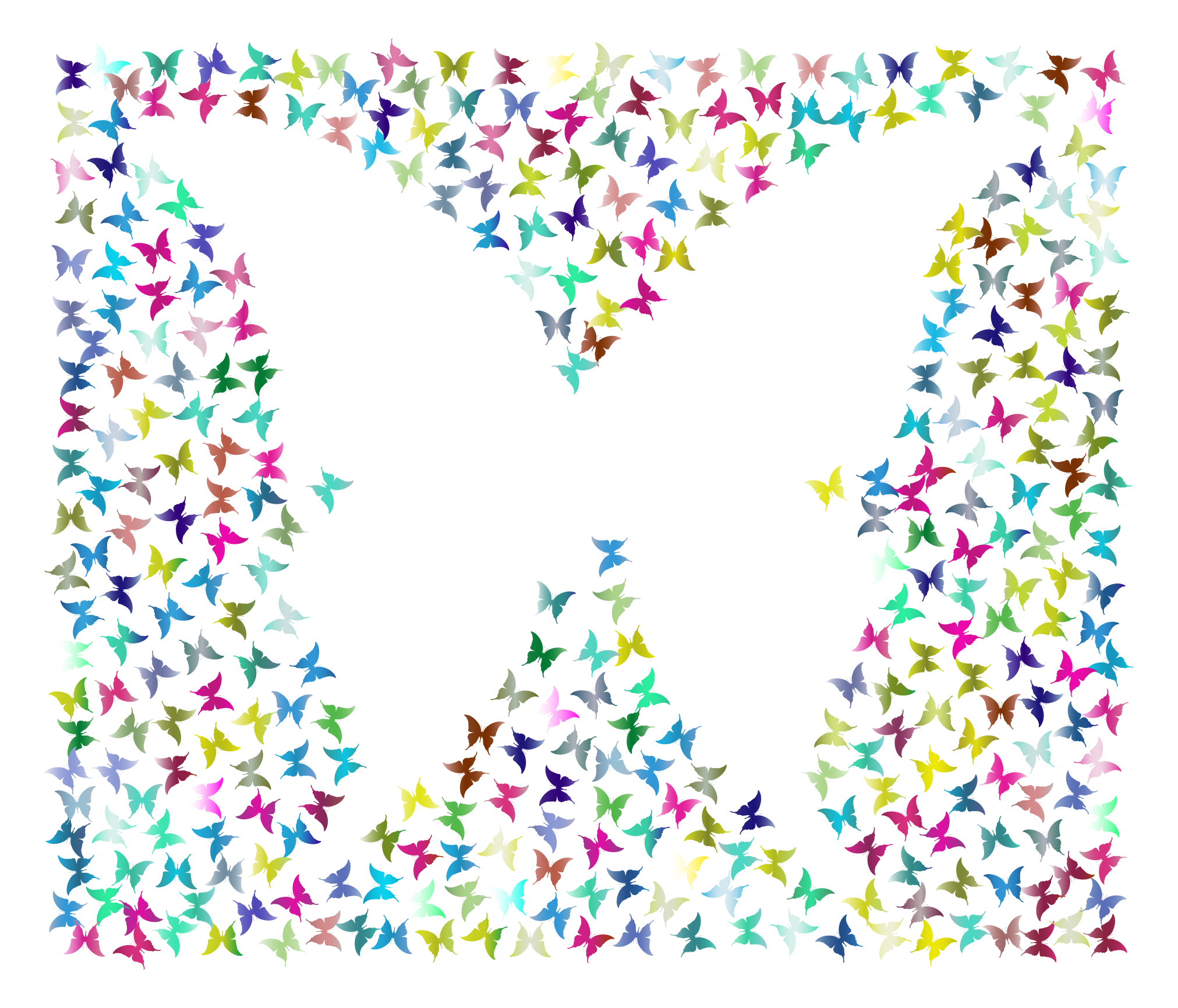 This features a large, colorful butterfly made up of many smaller butterflies. These smaller butterflies are scattered throughout the frame in various colors and sizes, creating an eye-catching pattern that resembles a kaleidoscope. The overall effect is a vibrant and lively display of butterflies, with each individual piece contributing to the larger composition. This artistic arrangement showcases the beauty of nature and the intricate patterns found in real butterfly wings.