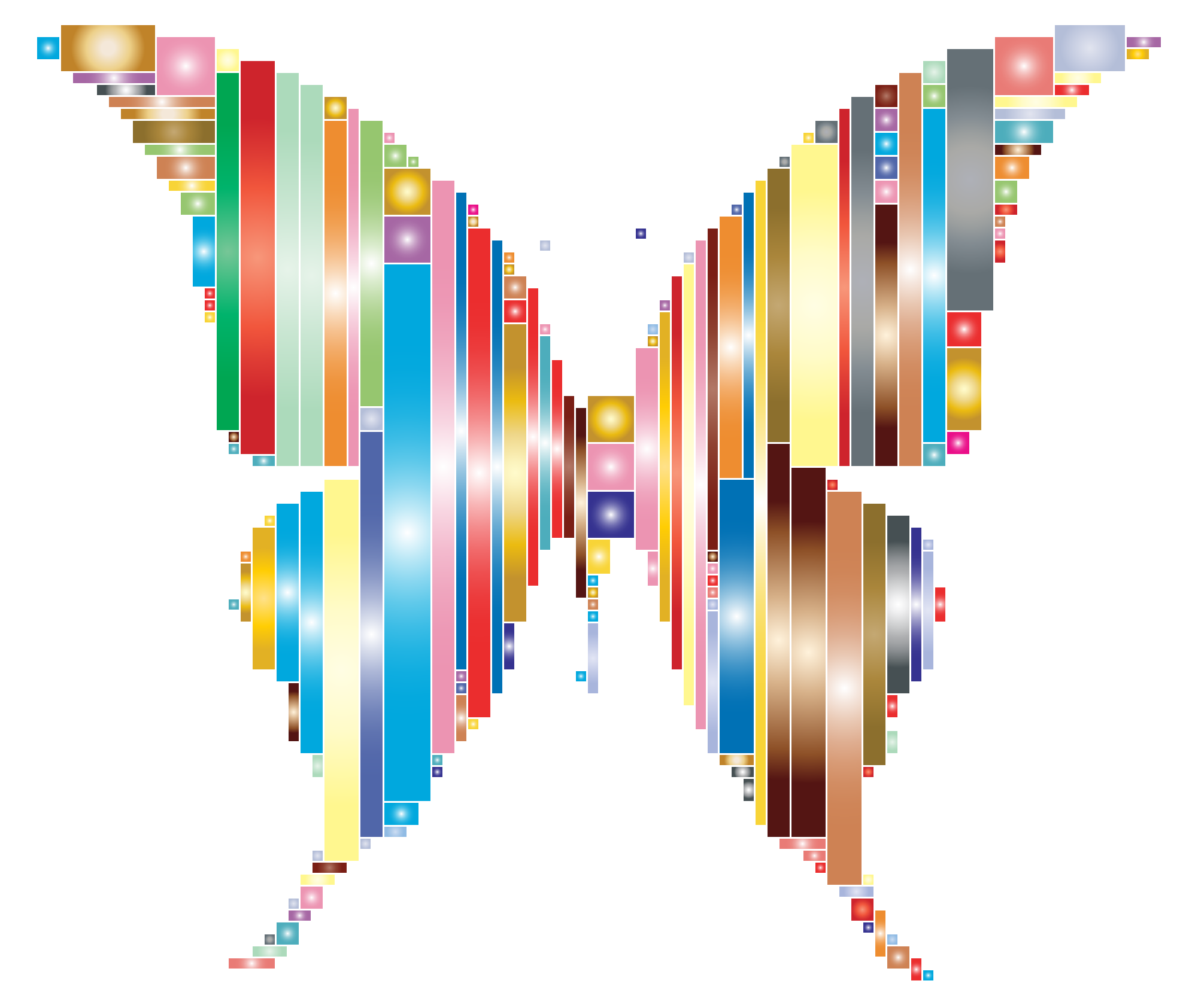 This features a large, colorful butterfly with wings that are made up of various colors. These colors include red, yellow, blue, green, and orange. The butterfly's wings are spread out in an open position, showcasing the vibrant hues. The butterfly is displayed prominently on a white background, allowing its colors to stand out even more. This artistic representation of a butterfly creates a visually appealing and eye-catching image.
