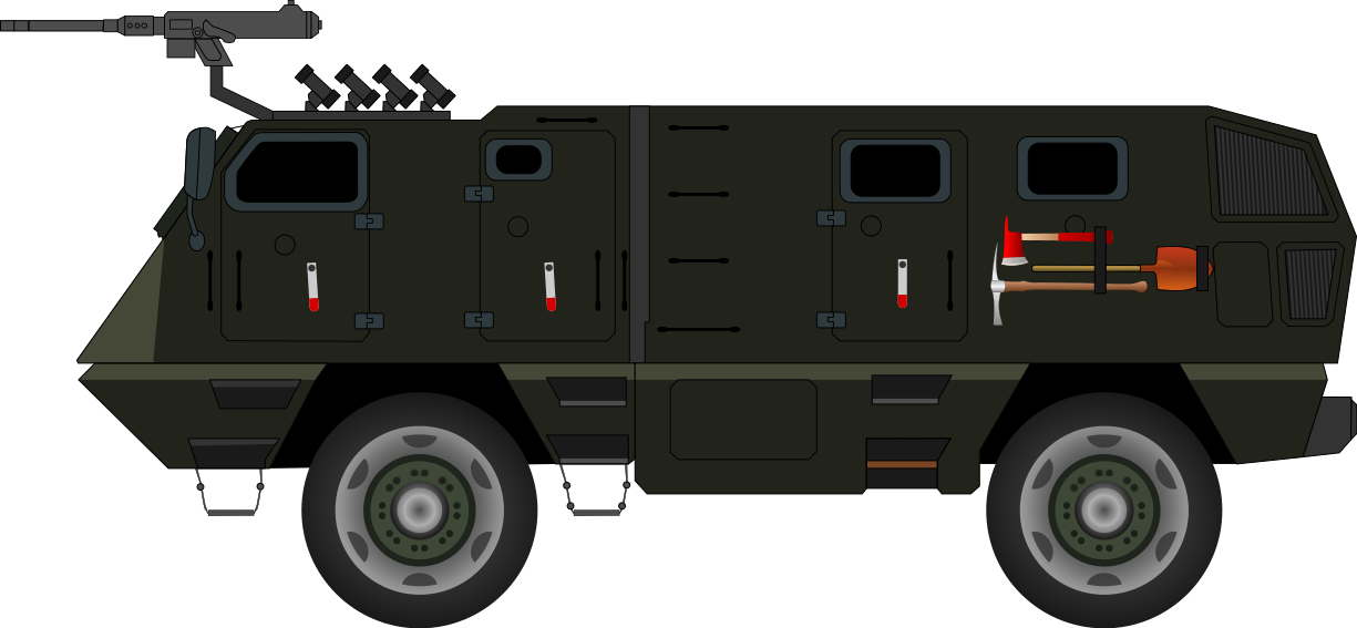 This features a large military truck with an open back, parked on the side of a road. The truck is equipped with various tools and weapons, including a machine gun mounted atop it. Additionally, there are multiple axes placed around the vehicle, as well as two shovels and a pickaxe nearby. This convoy appears to be prepared for any situation that may arise during its journey.