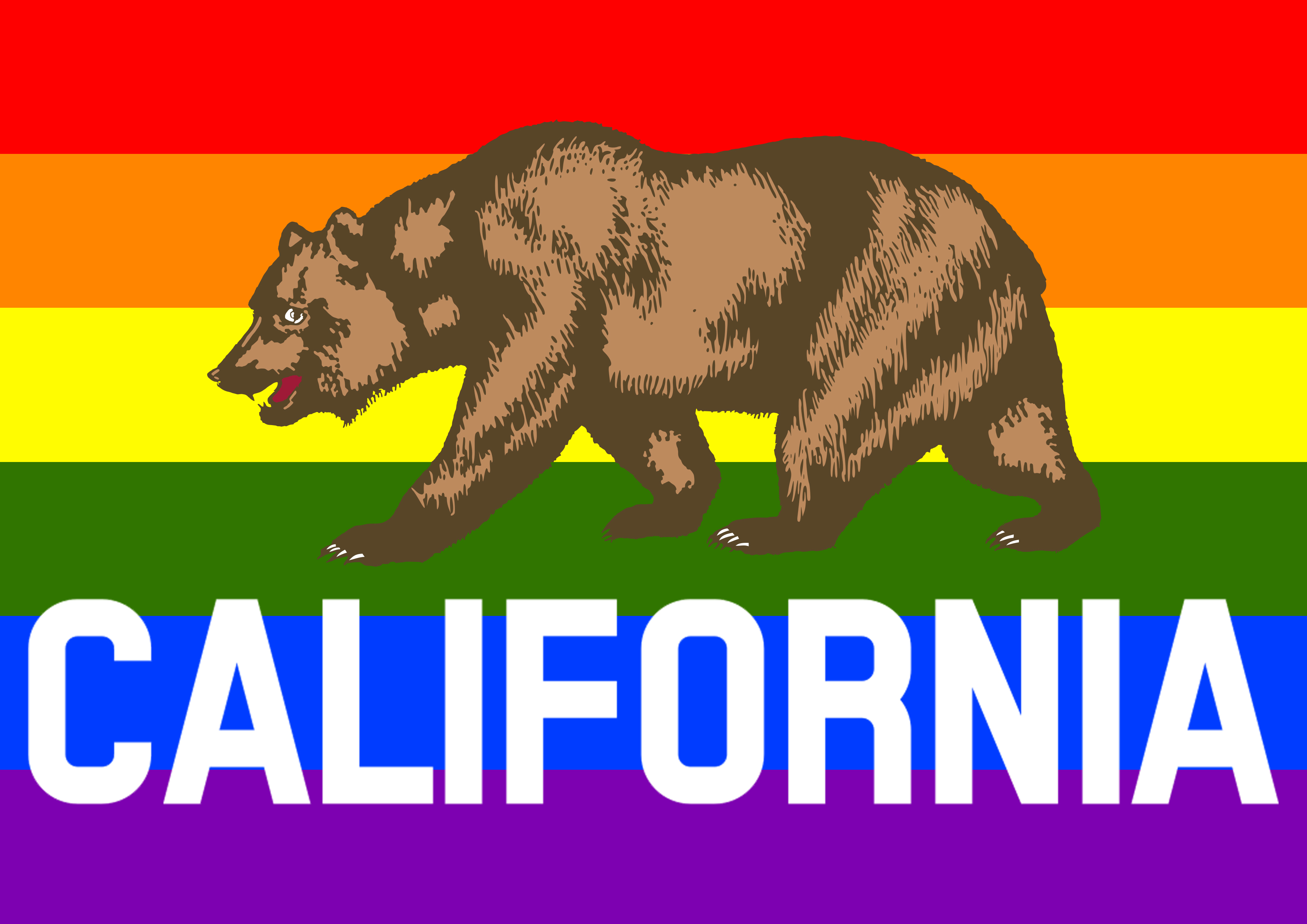 This features a large bear walking across the state of California. The bear is positioned in the center of the scene, with its body stretching from left to right. Above the bear, there is a rainbow flag that adds a vibrant touch to the scene. The word "California" is written below the bear, emphasizing the location of this iconic symbol.