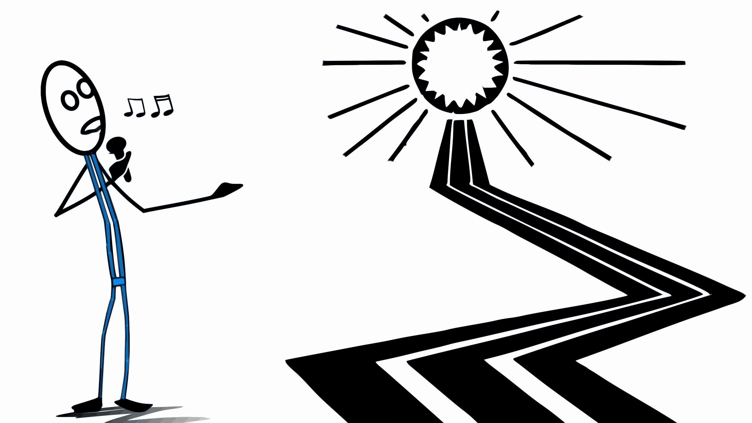 This features a man standing in front of an odd-shaped, black and white sun. He appears to be singing into a microphone while the sun is shining on him. The scene seems to be a creative representation of a musician performing under the sun's rays. The sun itself has a unique shape, with its edges curving inward towards the center, giving it an interesting appearance.