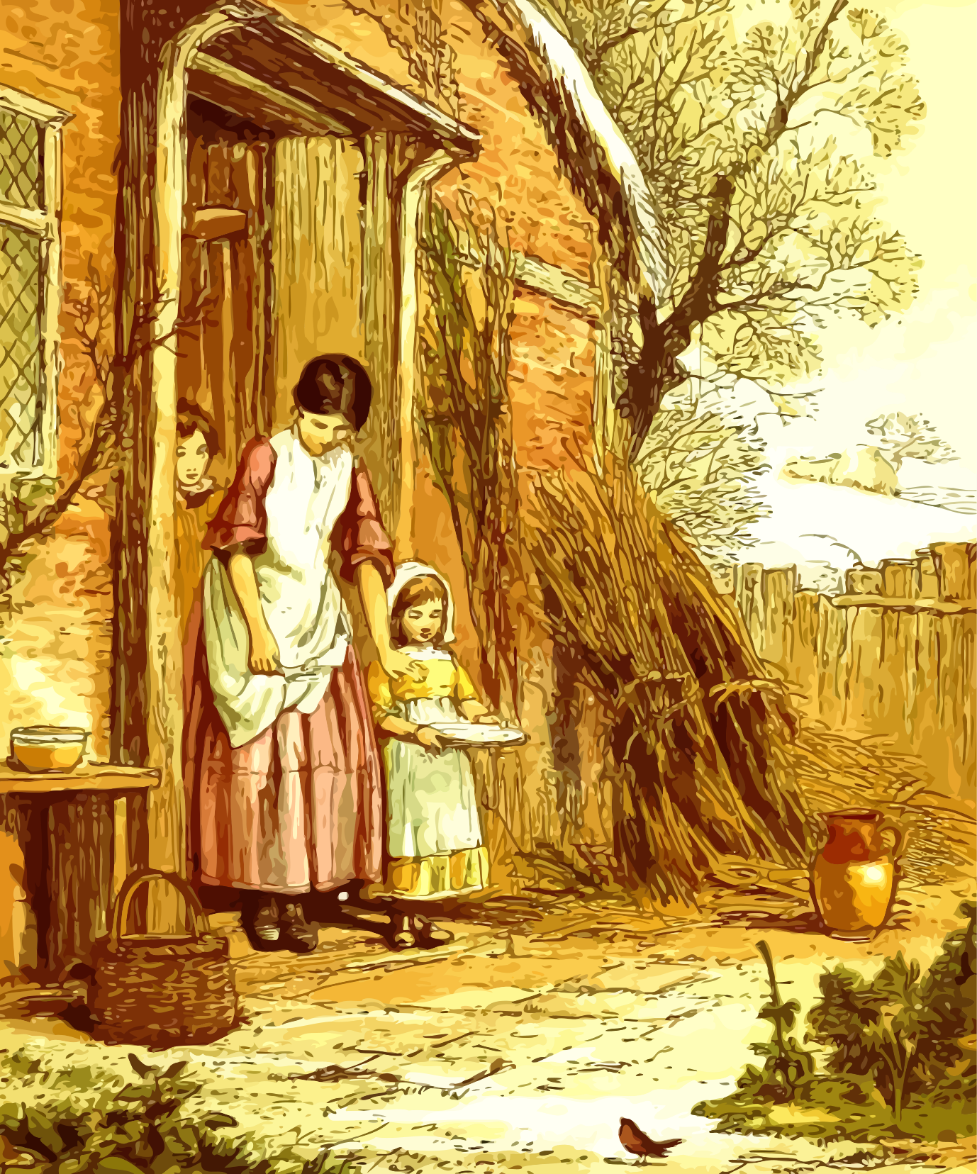 This depicts a woman and two children standing outside of a house. They are all dressed in old-fashioned clothing, with the woman wearing an apron. The woman is holding a basket while the children stand nearby. There is also a bird perched on the ground near them. The scene takes place outdoors, with a potted plant located to the right of the group and a vase placed further back in the scene. A chair can be seen close to the woman, possibly indicating that they were sitting down before moving outside. The overall atmosphere suggests a warm and welcoming family moment.