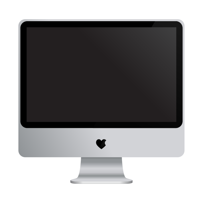 This features a silver desktop computer with a black screen. The monitor is turned off, giving it an empty appearance. The computer has a heart symbol on the bottom right corner of the screen, adding a touch of personality to the device. The overall design and color scheme give the impression that this could be an Apple product.