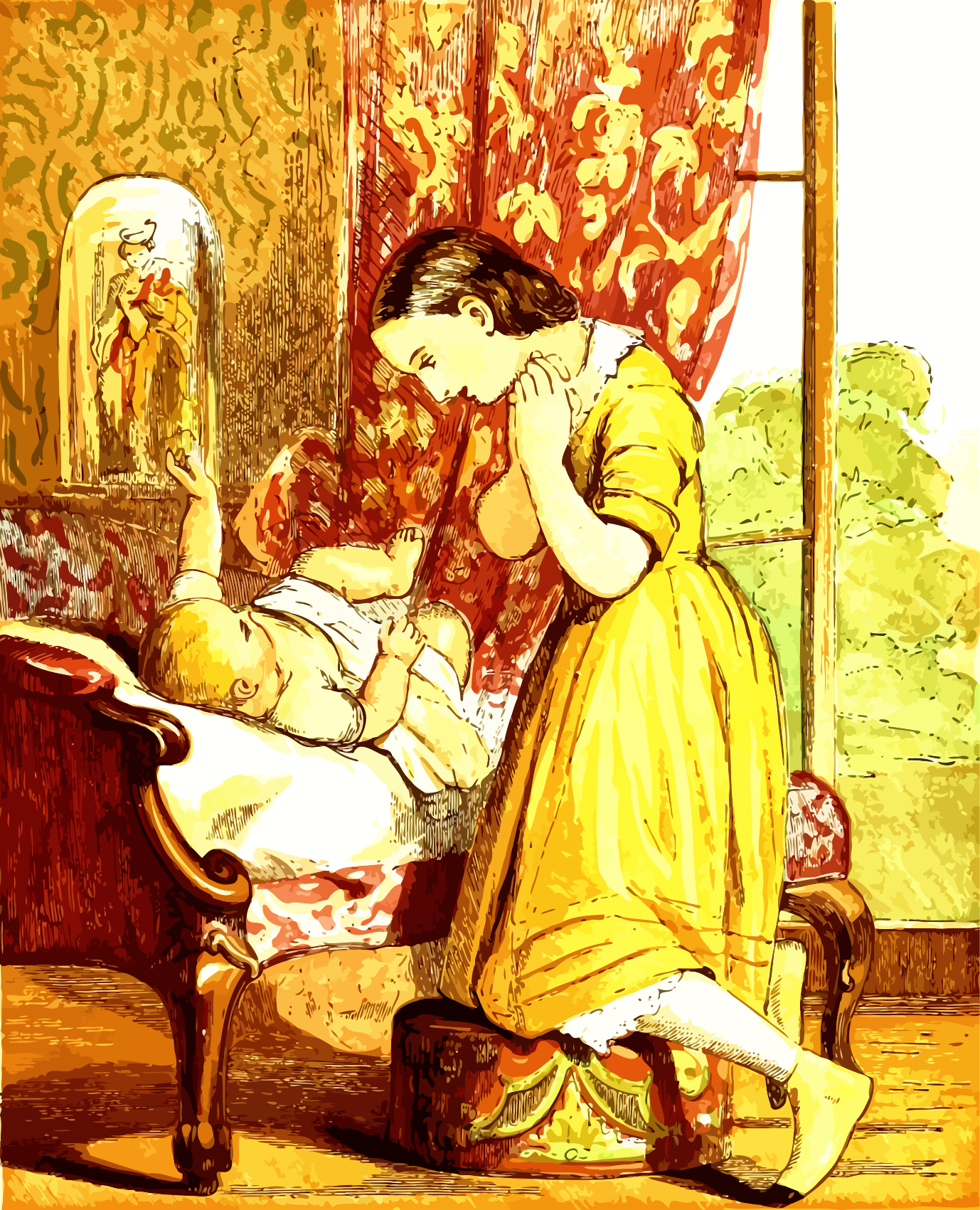 This depicts a woman kneeling down next to a child who is sitting on a bed. They appear to be engaged in an activity, possibly reading or playing together. The scene takes place in a room with a window nearby and a chair positioned against the wall. A vase can also be seen placed near the window, adding a decorative touch to the space.