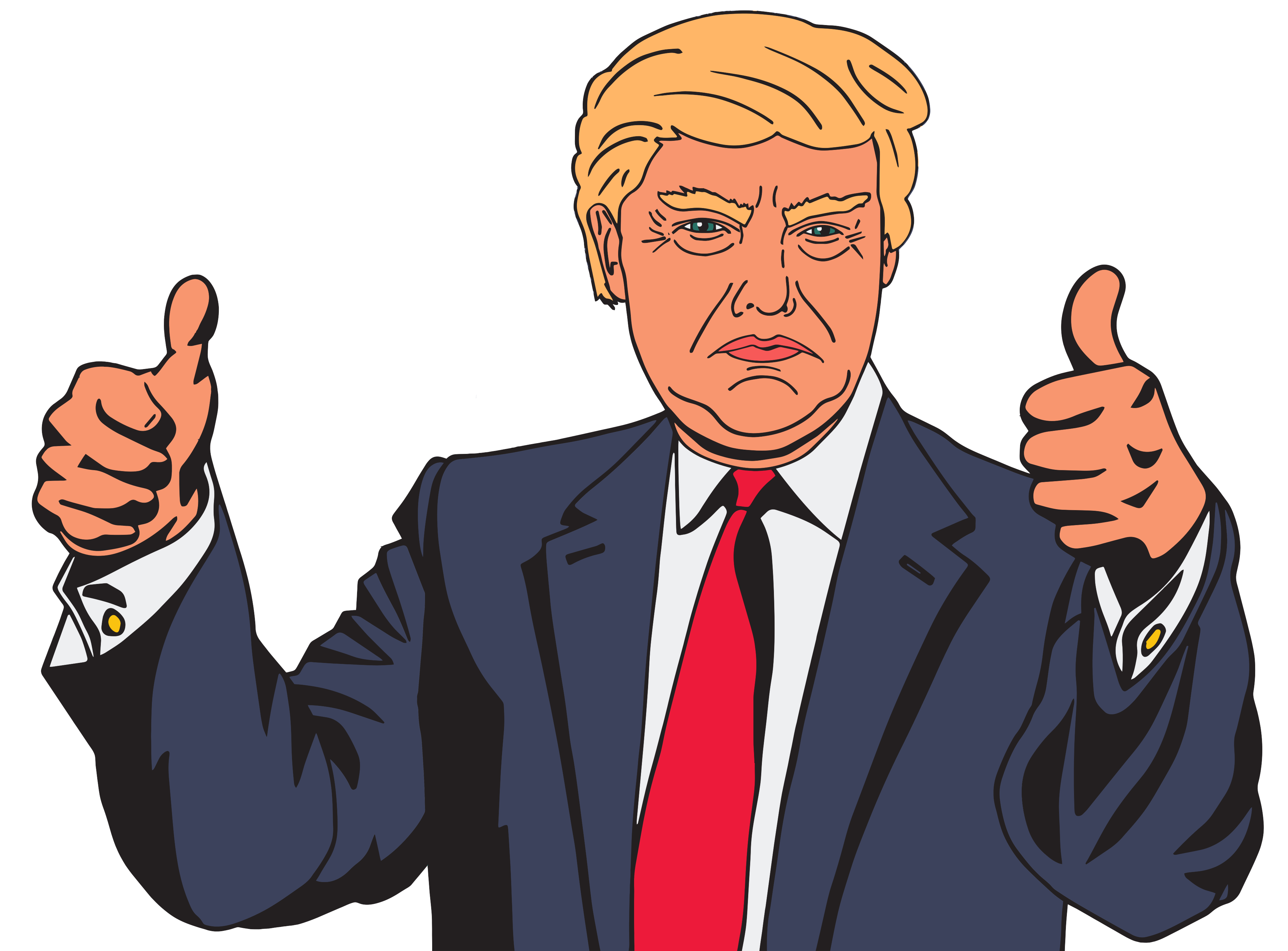 This features a man wearing a suit and tie, giving two thumbs up. He appears to be a cartoon version of Donald Trump, with his signature red tie and white shirt. The man is standing in front of a table, possibly posing for the camera or making a statement. His expression seems to convey confidence and approval, as he gives the thumbs up sign.