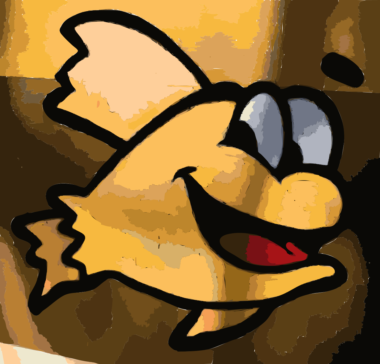 This features a cartoon fish with a big smile on its face. It appears to be the main focus of the scene, and it is positioned in the center of the picture. The fish has a yellow color and seems to be jumping out of the water, giving an impression of motion. The background consists of a wooden surface that adds texture and depth to the image.