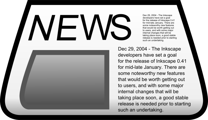 This is a newspaper headline that reads "News" in large white letters. Below the title, there are several paragraphs of text describing an article about developers setting goals for the release of Inkscape 0.41. The article highlights some notable new features and internal changes that will be included in this upcoming release. It also mentions that a good stable release is needed before starting to work on other projects, such as getting ready for a good stable release.