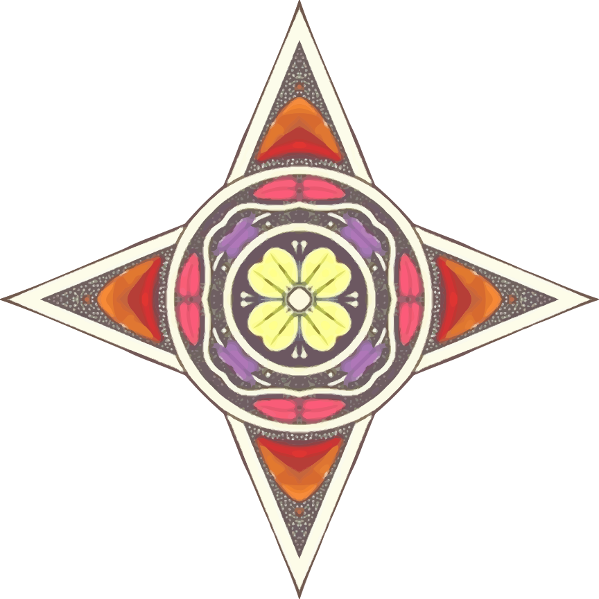 This features a colorful star with an intricate design. It is composed of various shapes and colors, including red, yellow, purple, orange, and pink. The star has a central point that resembles a flower, adding to its visual appeal. The overall composition of the star appears to be a blend of geometric patterns and natural elements, creating an eye-catching and unique design.