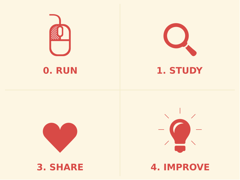 This features a set of four icons, each representing a different step in the process of creating free software. These icons are red and have a heart-shaped symbol on them, indicating that they are related to love or affection. Each icon has a numbered label, which corresponds to the specific step it represents. The first icon is labeled "0" and features a computer mouse, suggesting that this step involves setting up the software development environment. The second icon is labeled "1" and shows a lightbulb, indicating that this step involves brainstorming ideas or planning for the software. The third icon is labeled "2" and has a book on it, representing the research phase of software development. Finally, the fourth icon is labeled "3" and features a heart, signifying that this step involves sharing the software with others to get feedback and improve its functionality.